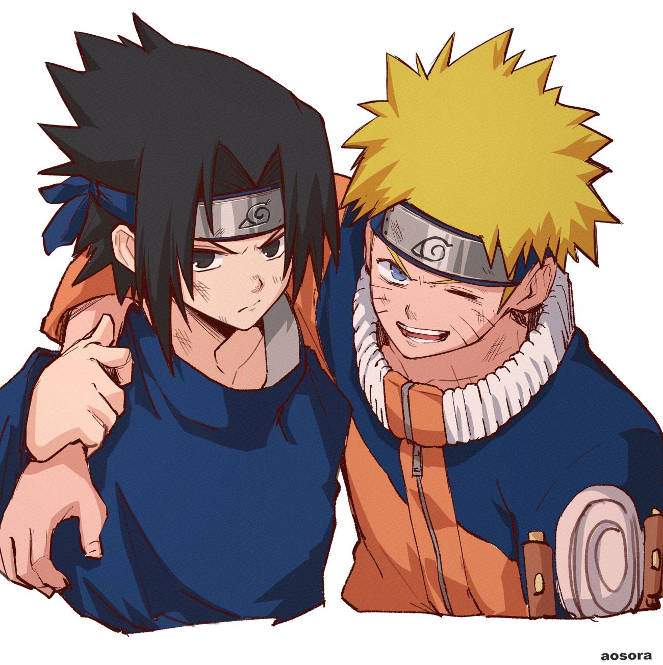 2boys aosora2823 arm_over_shoulder artist_name black_eyes black_hair blonde_hair blue_eyes blue_shirt facial_mark high_collar highres injury jacket male_focus multiple_boys naruto_(classic) naruto_(series) orange_jacket shirt short_hair simple_background spiked_hair uchiha_sasuke uzumaki_naruto whisker_markings white_background zipper_pull_tab