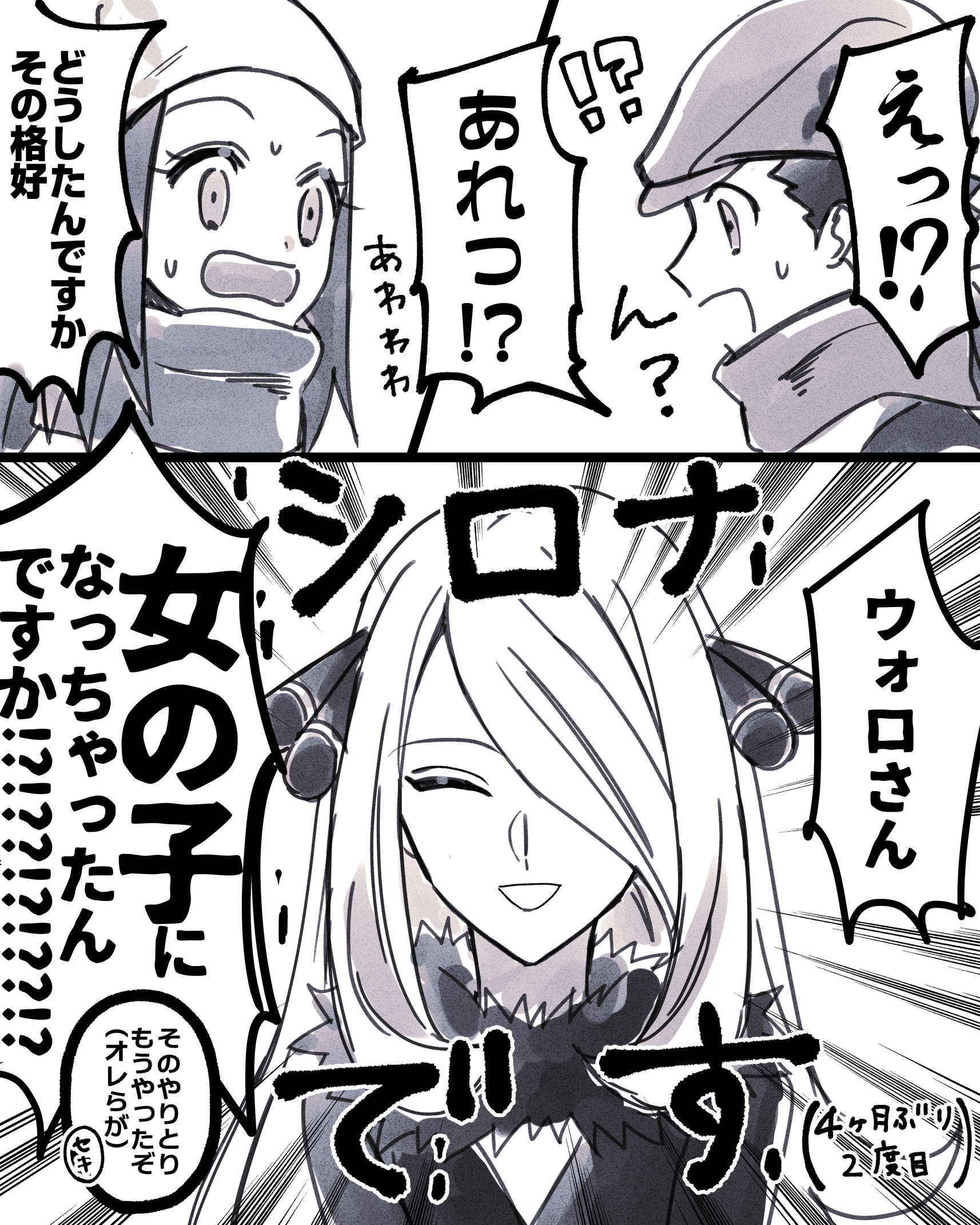 !? 1boy 2girls ? akari_(pokemon) closed_eyes cynthia_(pokemon) fur_collar greyscale hair_ornament hair_over_one_eye hat headscarf highres long_hair monochrome multiple_girls nintendo open_mouth pokemon pokemon_dppt pokemon_legends:_arceus rei_(pokemon) scarf sidelocks smile surprised sweat sweatdrop takigami_san translation_request