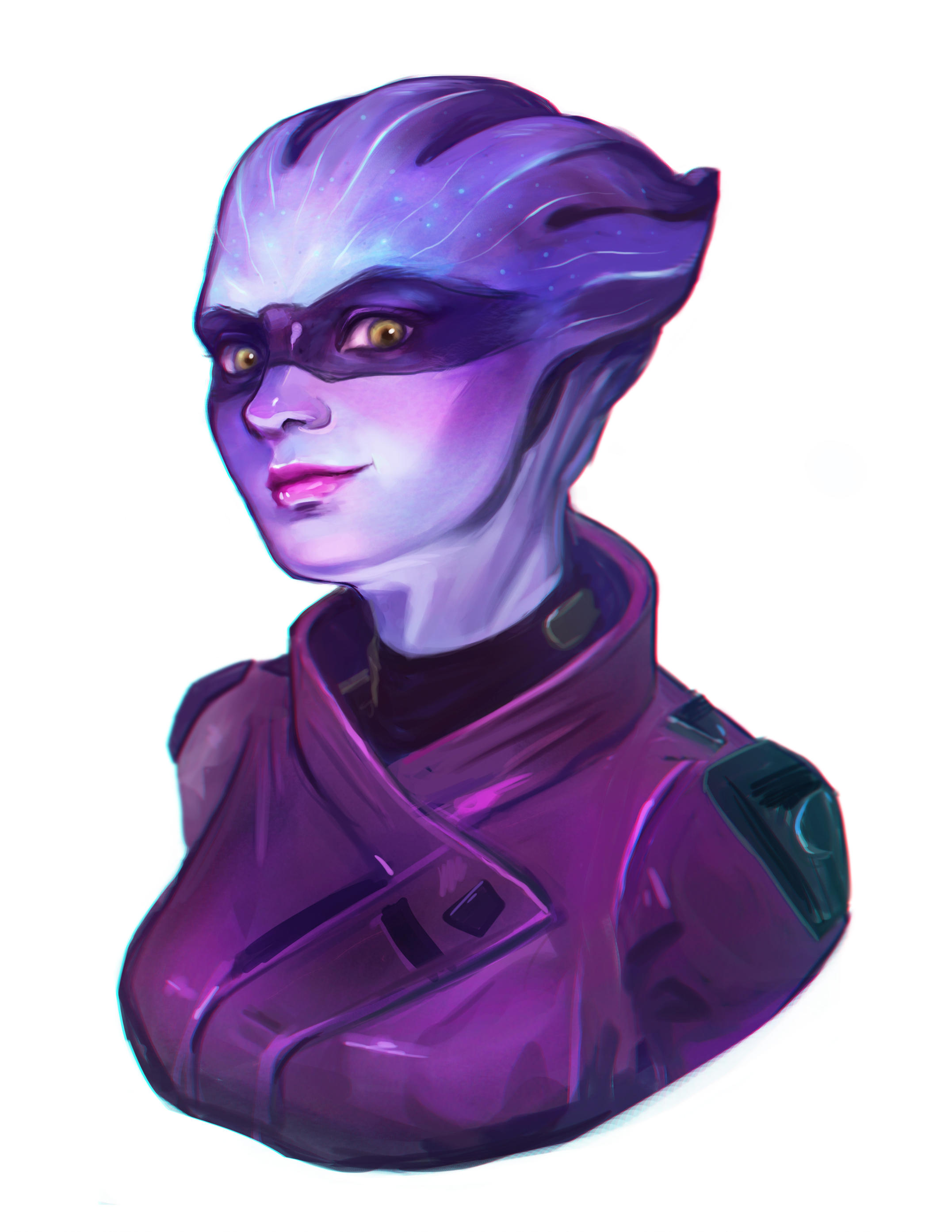 1girl absurdres alien asari_(mass_effect) colored_skin green_eyes highres jacket jzxl looking_at_viewer mass_effect:_andromeda mass_effect_(series) pelessaria_b'sayle pink_lips purple_jacket purple_skin simple_background solo upper_body white_background