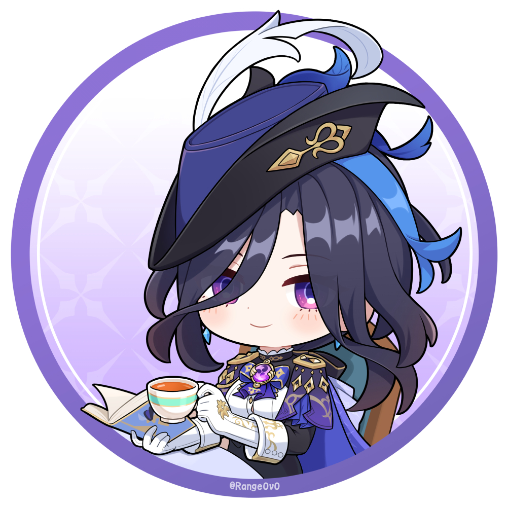 1girl blue_cape book cape clorinde_(genshin_impact) cup earrings genshin_impact gloves hat hat_feather holding holding_book holding_cup jewelry jiu_fanglianhua long_hair looking_at_viewer purple_eyes purple_hair shirt smile solo teacup tricorne upper_body white_gloves white_shirt