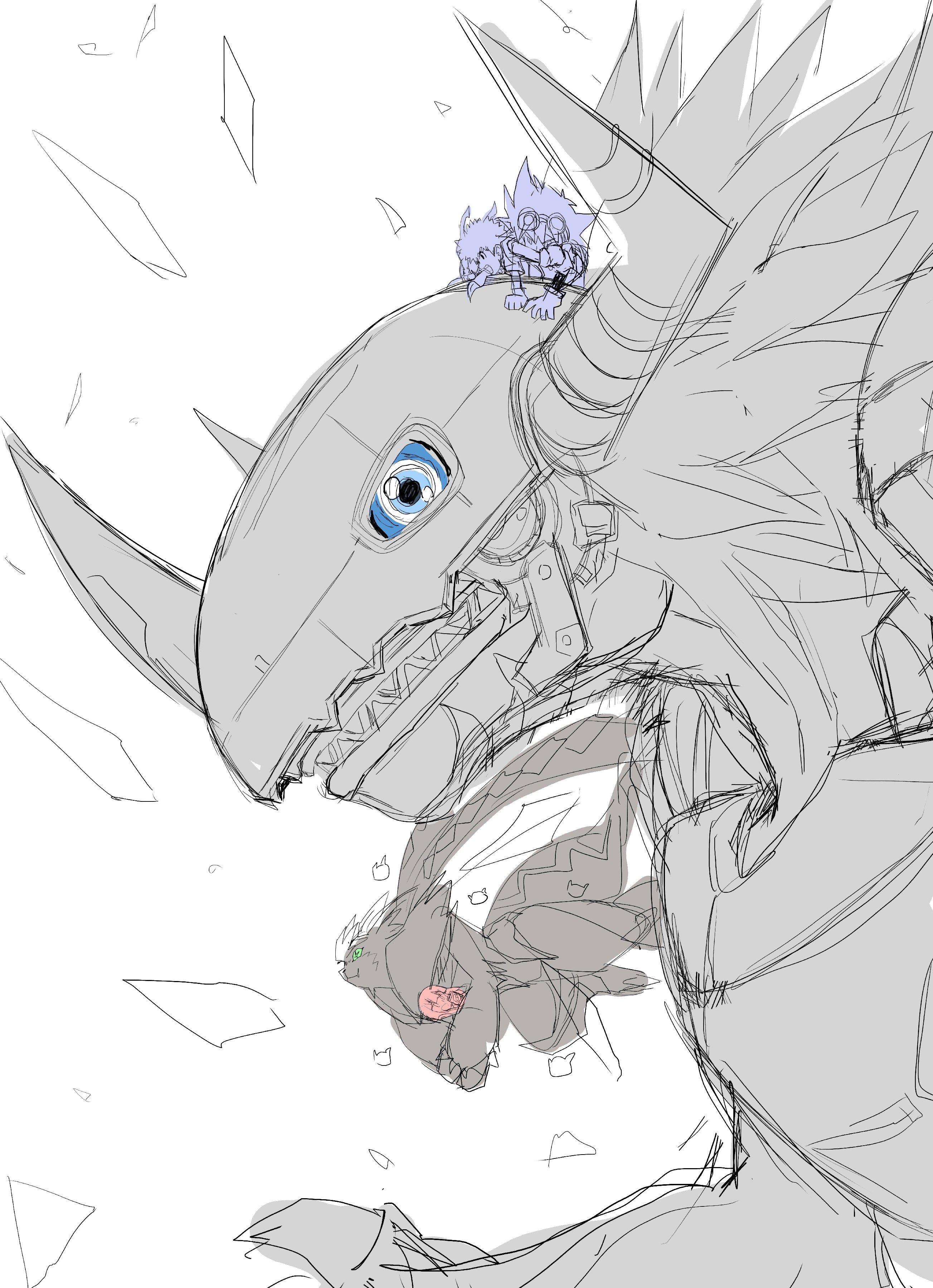 absurdres aged_down curry_lun cyborg digimon digimon_(creature) highres izumi_koshiro meicrackmon metalgreymon mochizuki_meiko sharp_teeth teeth tentomon yagami_taichi