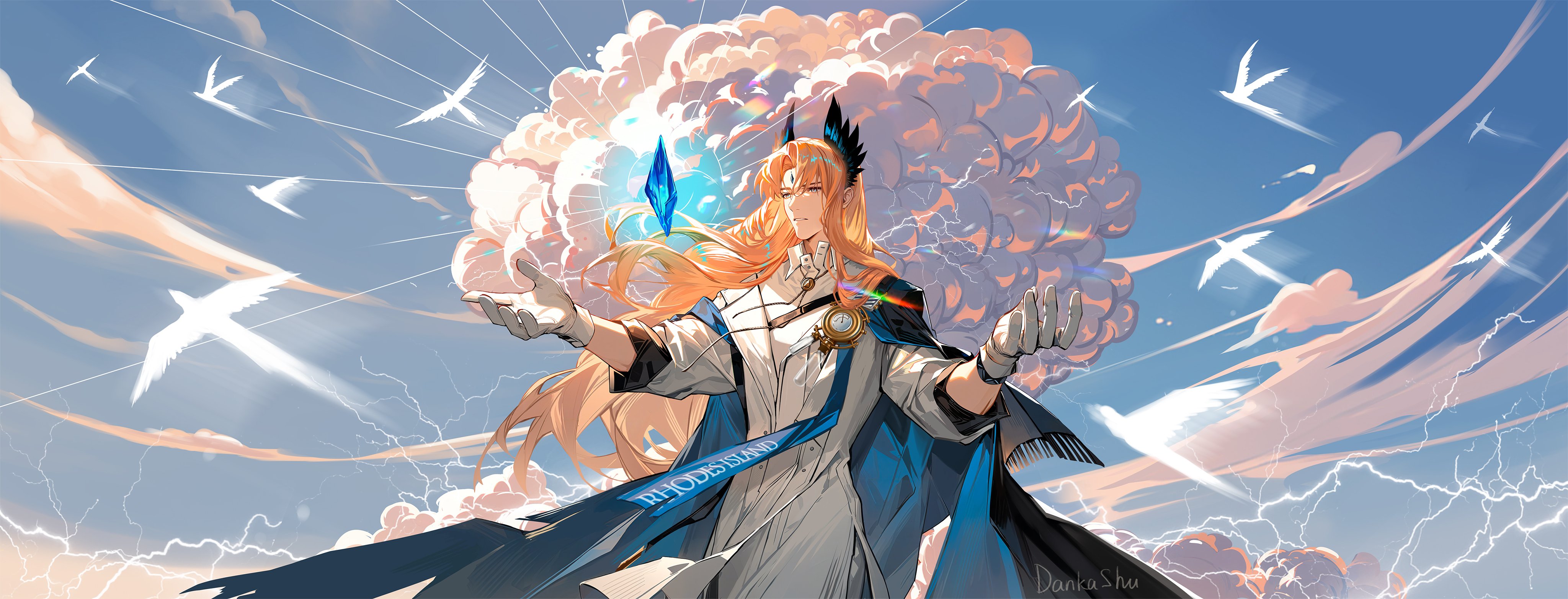 1boy absurdres arknights bad_link bird cloud dankashu facial_mark forehead_jewel forehead_mark gem gloves glowing_gem highres lightning long_hair orange_hair passenger_(arknights) simple_bird sky solo white_gloves