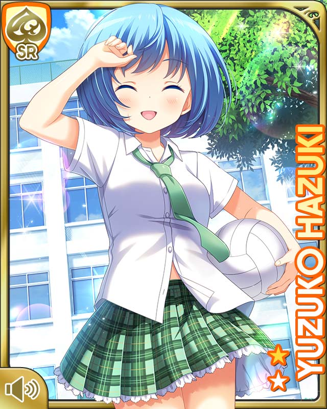 1girl ball blue_eyes blue_hair card character_name closed_eyes day girlfriend_(kari) green_necktie green_skirt hazuki_yuzuko necktie official_art open_mouth outdoors plaid_clothes plaid_skirt qp:flapper school shirt shoes short_hair skirt smile socks solo tagme volleyball_(object) white_shirt wiping_sweat