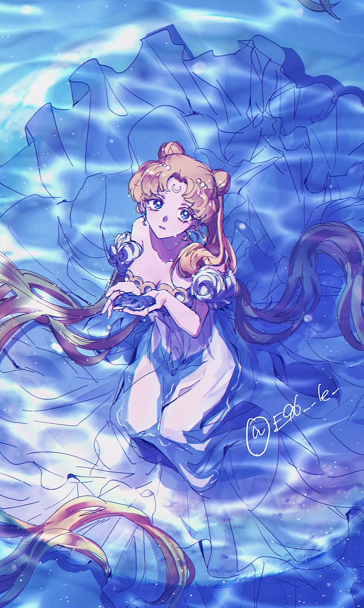 1girl bishoujo_senshi_sailor_moon blonde_hair blue_eyes breasts cleavage commentary crescent crescent_facial_mark double_bun dress ere_(1231_kuro_96) facial_mark from_above hair_bun hair_ornament highres holding_water long_hair medium_breasts off_shoulder parted_lips princess_serenity puffy_short_sleeves puffy_sleeves seiza short_sleeves sitting solo symbol-only_commentary tsukino_usagi twintails twitter_username very_long_hair water wet wet_clothes wet_dress white_dress