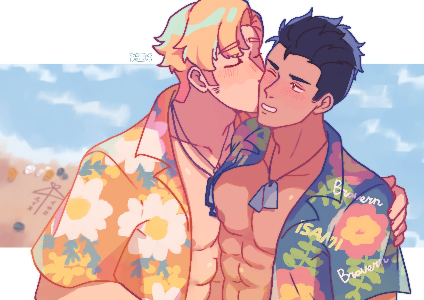 2boys abs ao_isami bara black_hair blonde_hair blush closed_eyes couple dark-skinned_male dark_skin dog_tags facial_hair highres kaindycandy kiss kissing_cheek large_pectorals lewis_smith male_focus multiple_boys muscular muscular_male one_eye_closed pectoral_cleavage pectoral_press pectorals sideburns_stubble stubble thick_eyebrows upper_body yaoi yuuki_bakuhatsu_bang_bravern