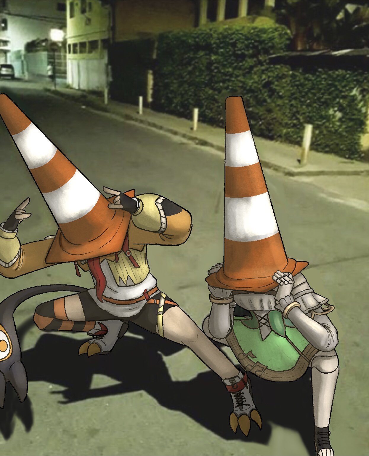 0verzealos 2girls black_shorts cecilia_immergreen cecilia_immergreen_(1st_costume) doll_joints dress fingerless_gloves full_body gigi_murin gigi_murin_(1st_costume) gloves green_dress hands_up hashtag-only_commentary highres hololive hololive_english joints long_sleeves m/ multiple_girls night orange_shrug outdoors photo-referenced photo_background road shorts shrug_(clothing) squatting thighs traffic_cone_on_head virtual_youtuber