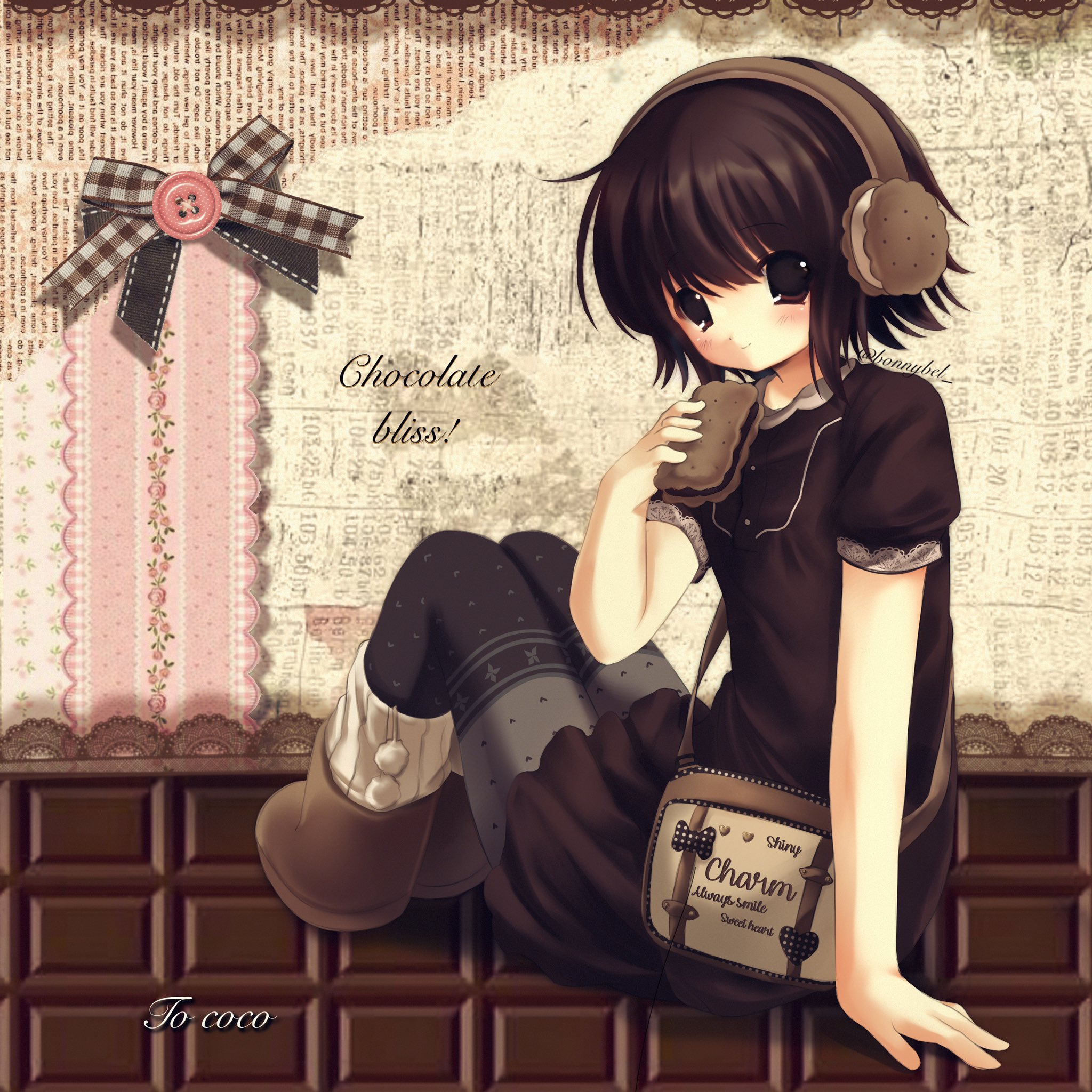 1girl 2000s_(style) bag boots bow brown_boots brown_eyes brown_hair brown_theme chocolate commentary dress earmuffs english_text food from_behind full_body hashtag-only_commentary highres holding holding_food ice_cream ice_cream_sandwich jelly_(bonnybel) looking_at_viewer looking_back newsprint_background original pom_pom_(clothes) s'more short_sleeves sitting solo