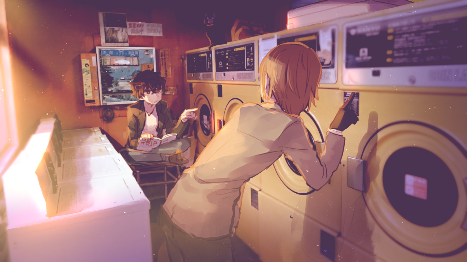 2boys akechi_gorou amamiya_ren bag black_eyes black_gloves black_hair black_jacket blurry book brown_footwear brown_hair brown_jacket brown_pants cat clip_studio_paint_(medium) clothes_dryer collar commentary_request fujimi_nanna gloves highres holding holding_book indian_style indoors jacket laundromat light_particles long_sleeves morgana_(cat)_(persona_5) morgana_(persona_5) multiple_boys open_book pants persona persona_5 shoes short_hair sitting washing_machine yellow_collar