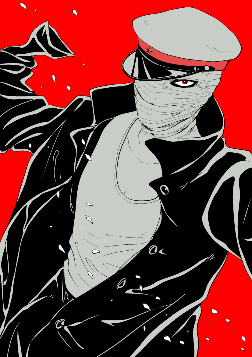 1boy amputee bandage_on_face bandages burn_scar collarbone double_amputee hat hat_over_one_eye jacket looking_at_viewer male_focus midoro peaked_cap petals red_background red_eyes scar shoujo_tsubaki solo spot_color tank_top tied_sleeves tokkuriji_muchisute