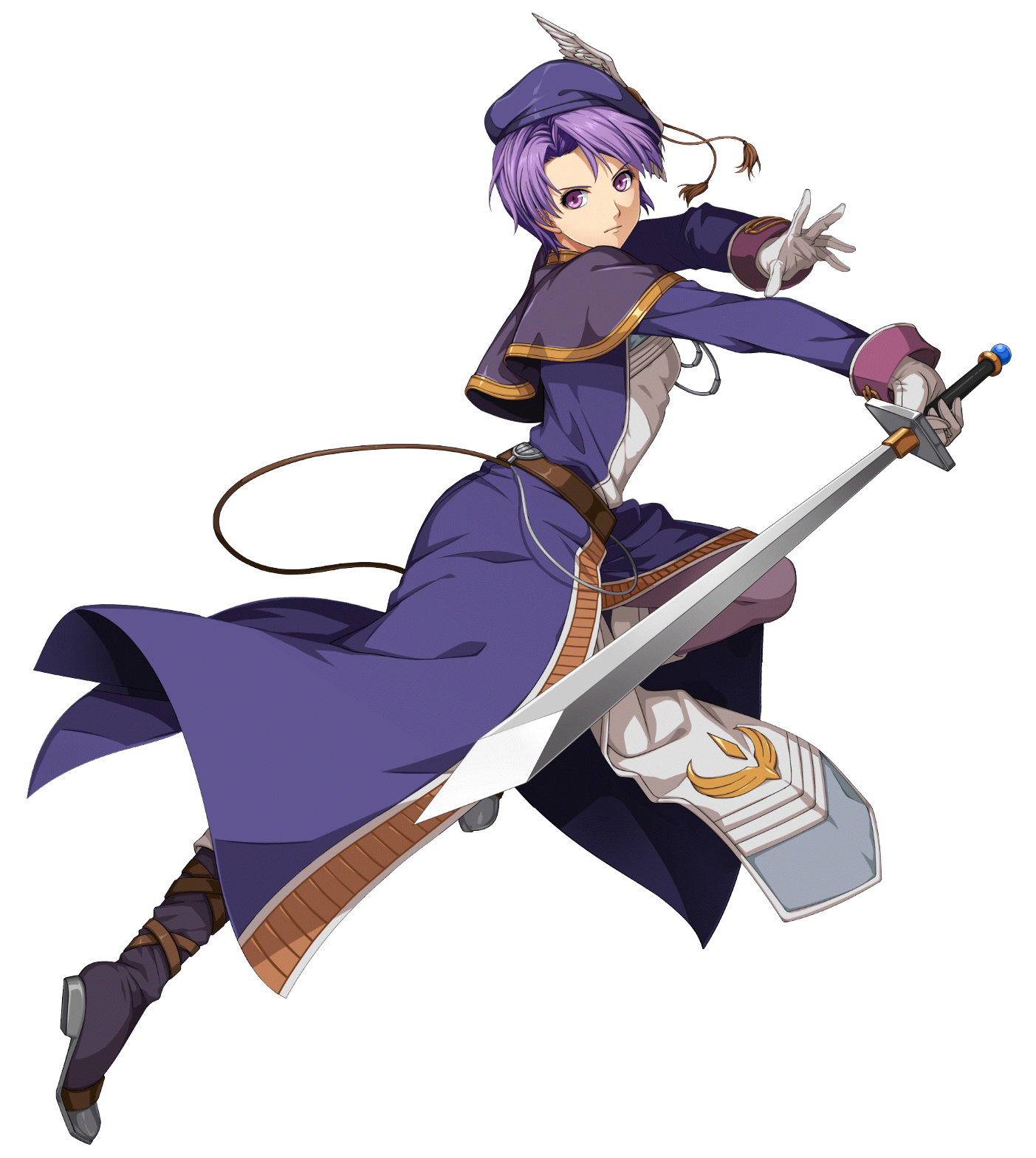 1girl akatsuki_no_kiseki alternate_costume black_capelet boots capelet coat cosplay eiyuu_densetsu frown gloves hat highres holding holding_sword holding_weapon julia_schwarz julia_schwarz_(cosplay) kloe_rinz long_sleeves looking_at_viewer official_art pants purple_boots purple_coat purple_eyes purple_hair purple_hat purple_pants shirt short_hair solo sora_no_kiseki sword transparent_background weapon white_gloves white_shirt
