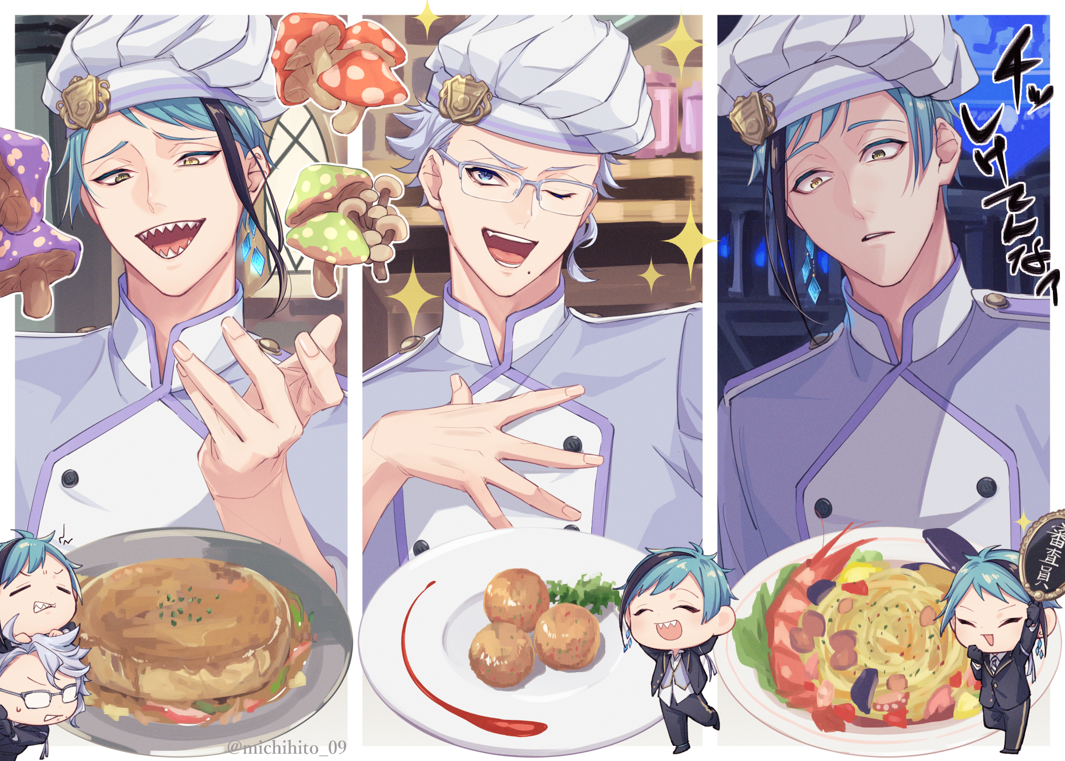 3boys azul_ashengrotto blue_eyes blue_hair brown_eyes chef chef_hat chibi chibi_inset floyd_leech food glasses grey_hair hand_on_own_chest hat heterochromia highres jade_leech looking_at_viewer male_focus meatball michihito mole mole_under_mouth multiple_boys sharp_teeth short_hair teeth translation_request twisted_wonderland upper_body yellow_eyes