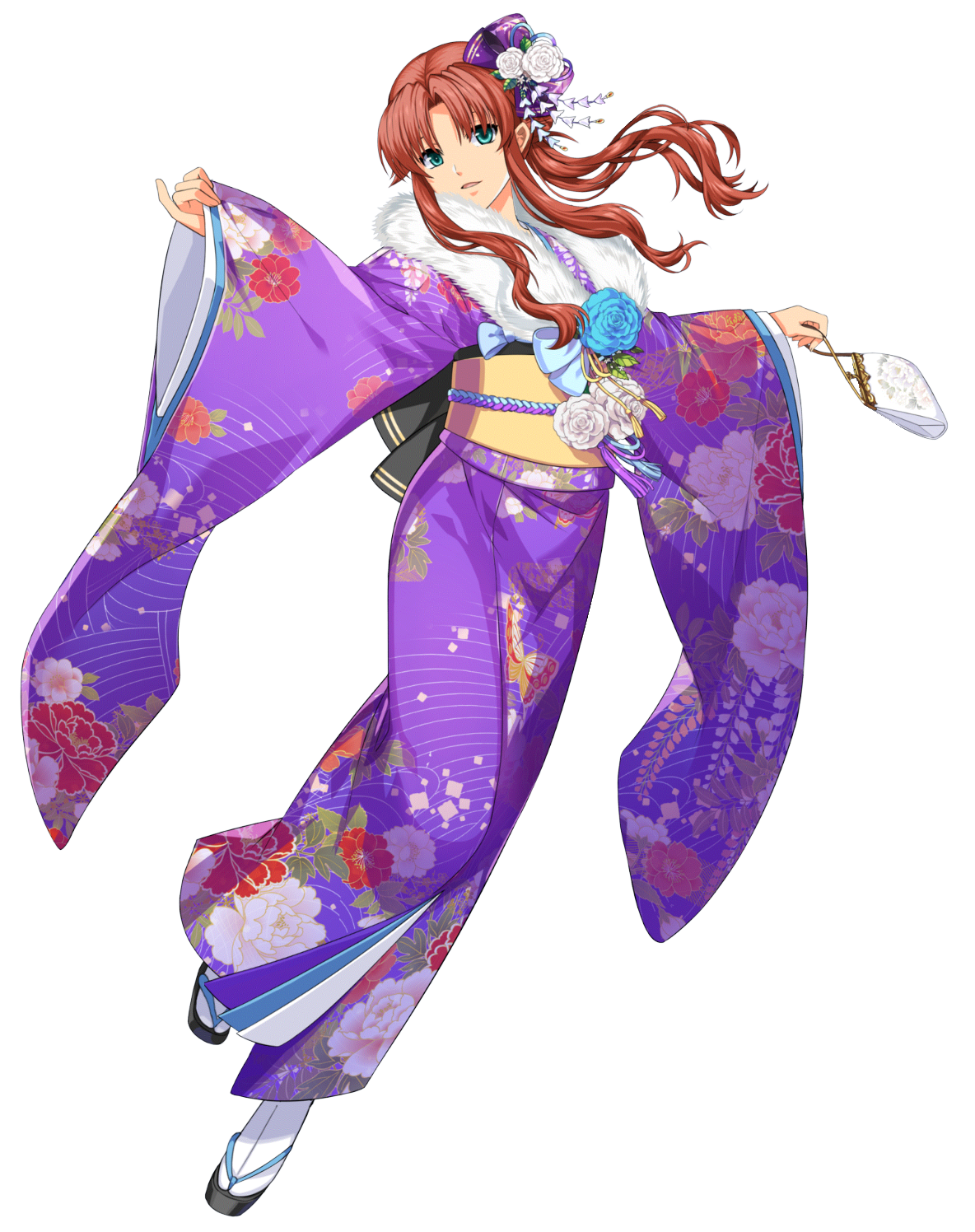 1girl akatsuki_no_kiseki bow brown_hair eiyuu_densetsu floating_hair floral_print flower full_body green_eyes hair_bow hair_flower hair_intakes hair_ornament highres japanese_clothes kimono long_hair long_sleeves looking_at_viewer obi official_art print_kimono purple_bow purple_kimono ries_argent sash socks solo sora_no_kiseki standing tabi third-party_source transparent_background white_flower white_socks wide_sleeves