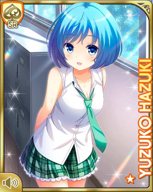 1girl blue_eyes blue_hair card character_name day girlfriend_(kari) green_necktie green_skirt hazuki_yuzuko indoors necktie official_art open_mouth plaid_clothes plaid_skirt qp:flapper school shirt shoes short_hair skirt sleeveless smile socks solo tagme white_shirt window