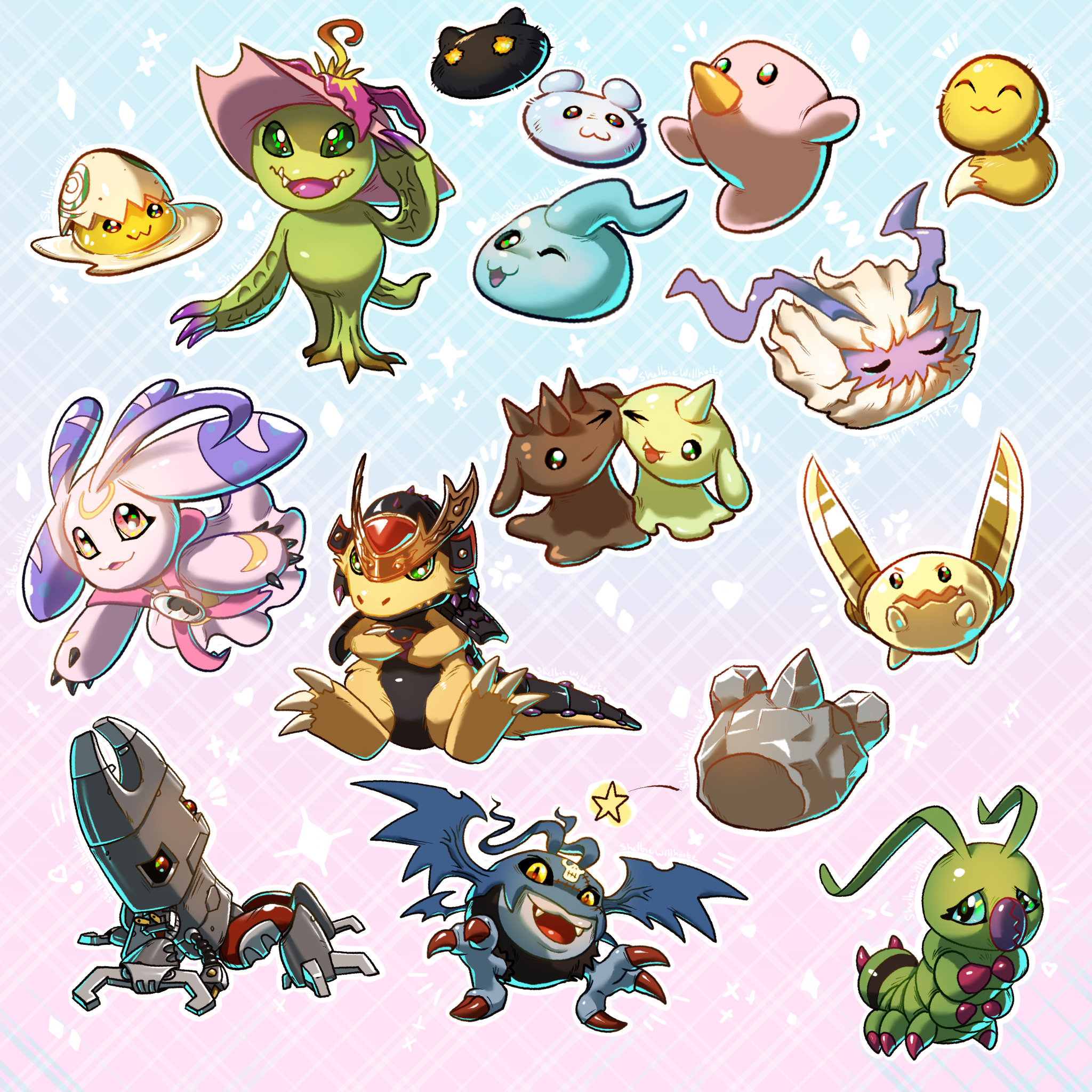 armor botamon chibimon chocomon crescent_moon digimon digimon_(creature) furry furry_female gorimon gummymon highres kokuwamon lunamon moon palmon picodevimon poromon rabbit_girl relemon ryudamon sakuttomon star_(symbol) wormmon yolkmon yukimibotamon yuramon