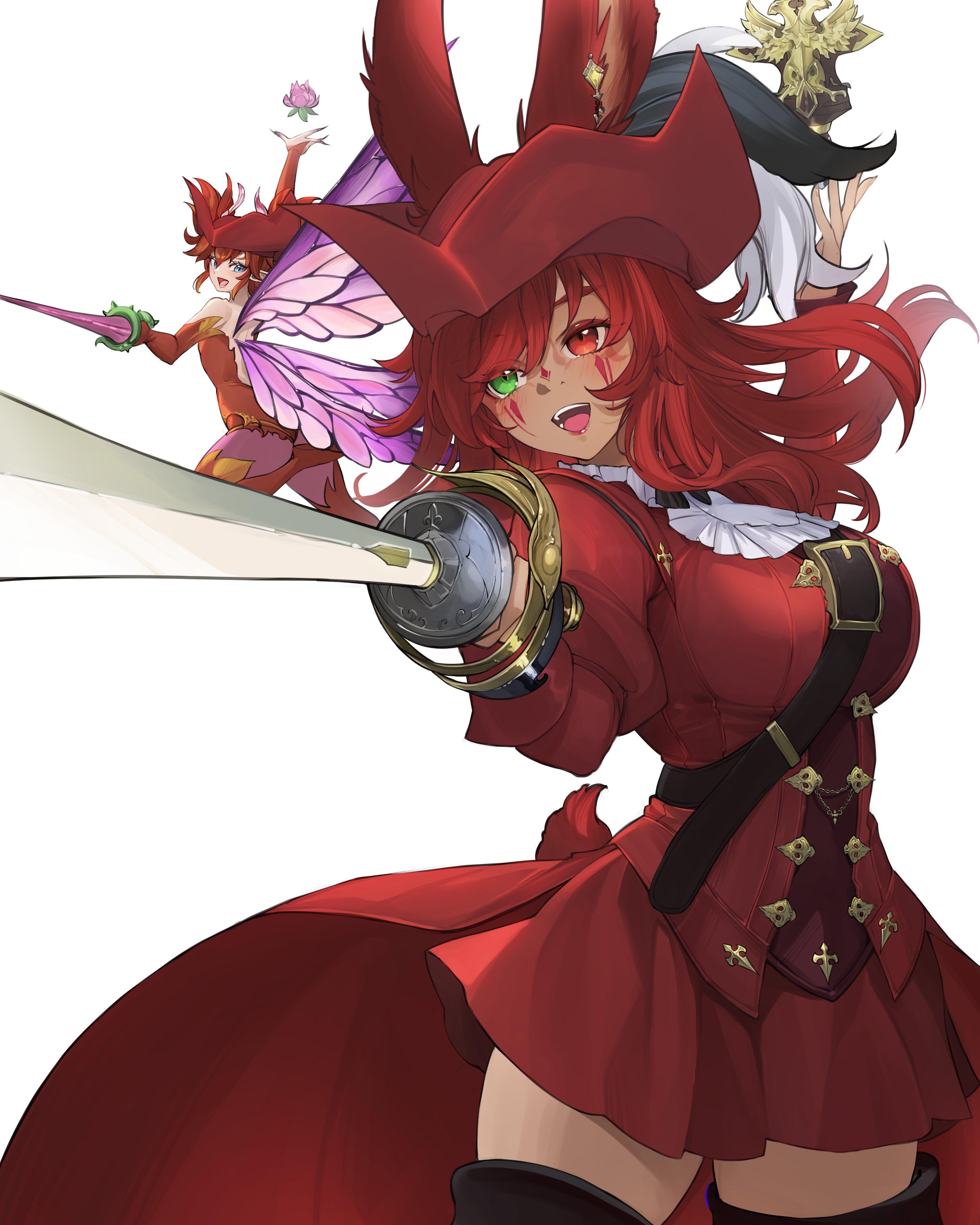 2girls absurdres animal_ears boots dark-skinned_female dark_skin facial_tattoo fairy feo_ul final_fantasy final_fantasy_xiv green_eyes hat heterochromia highres holding holding_sword holding_weapon long_hair multiple_girls open_mouth rabbit_ears rabbit_girl rabbit_tail rapier red_eyes red_hair red_hat red_mage_(final_fantasy) red_shirt red_skirt ritence shirt skirt sword tail tattoo thigh_boots viera warrior_of_light_(ff14) weapon white_background