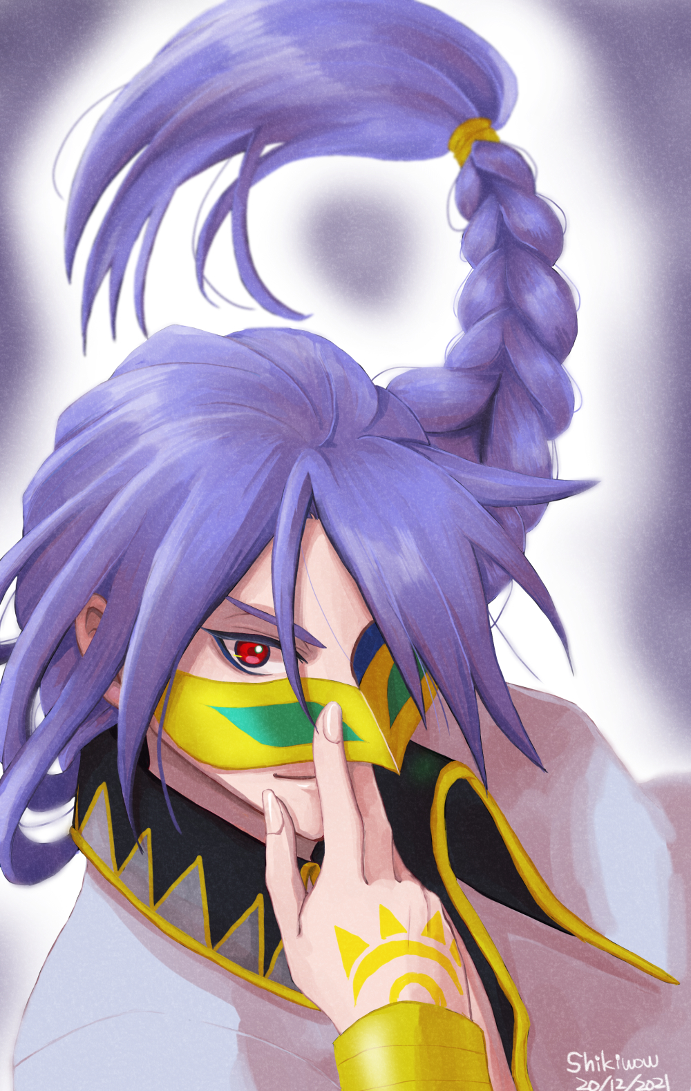 1boy artist_name braid chrono_cross dated guile_(chrono_cross) hair_over_one_eye hand_tattoo hand_up highres long_hair looking_at_viewer mask purple_hair red_eyes removing_mask shikiwo solo tattoo