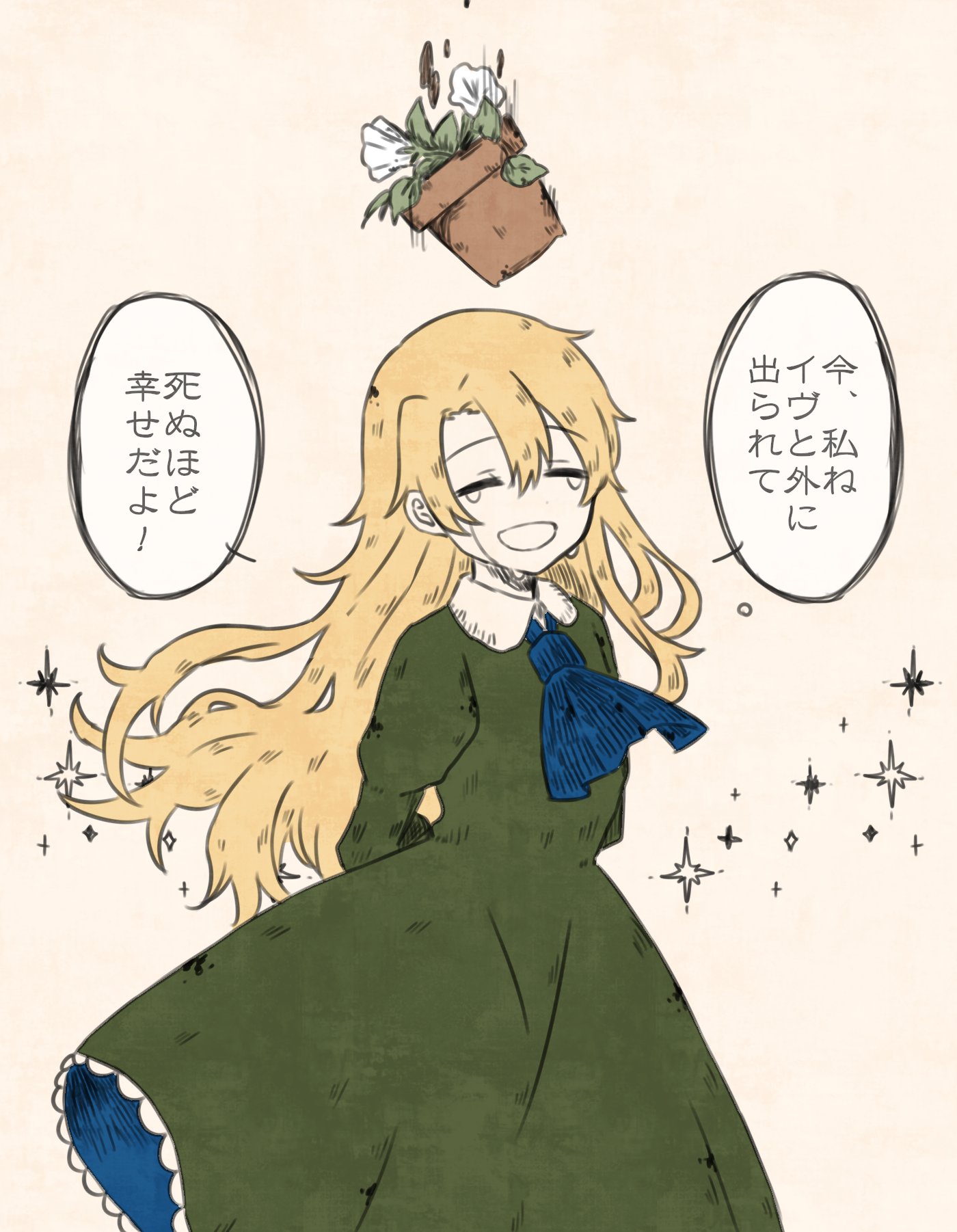 1girl arms_behind_back ascot blonde_hair blue_ascot brown_background closed_eyes collared_dress commentary_request crying dress facing_viewer feet_out_of_frame floating_hair flower flower_pot green_dress happy_tears highres ib_(kouri) juliet_sleeves kuiruri long_hair long_sleeves mary_(ib) open_mouth peril puffy_sleeves simple_background smile solo speech_bubble standing tears translation_request white_flower