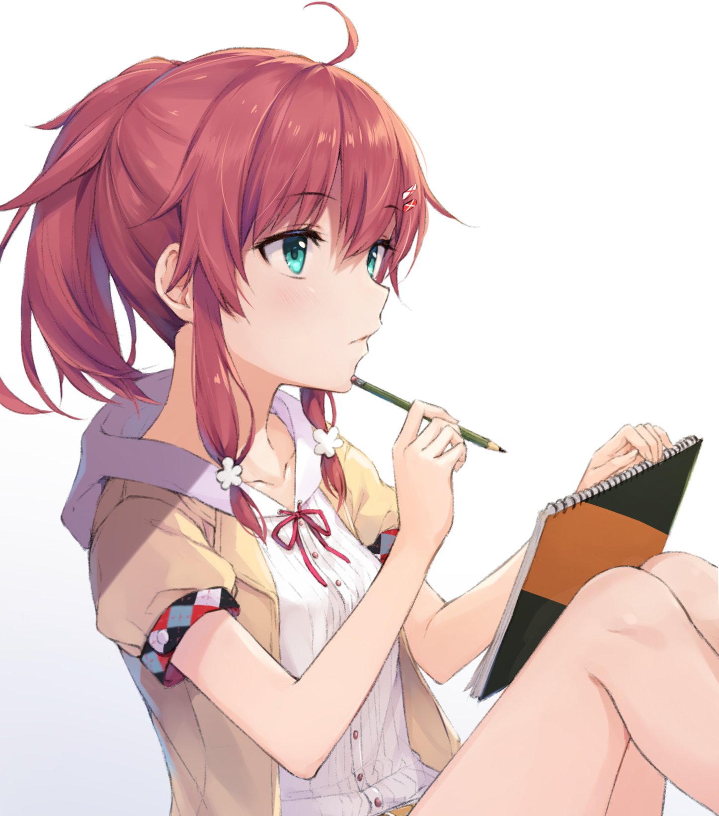 ahoge aqua_eyes bow bowtie breasts buttons closed_mouth cofetaru collarbone commentary_request flower from_side hair_flower hair_ornament hairclip highres holding holding_pencil hood hood_down jacket looking_afar maitetsu medium_hair migita_hibiki open_clothes open_jacket pencil ponytail red_bow red_bowtie red_hair shirt short_sleeves sitting sketchbook small_breasts white_shirt