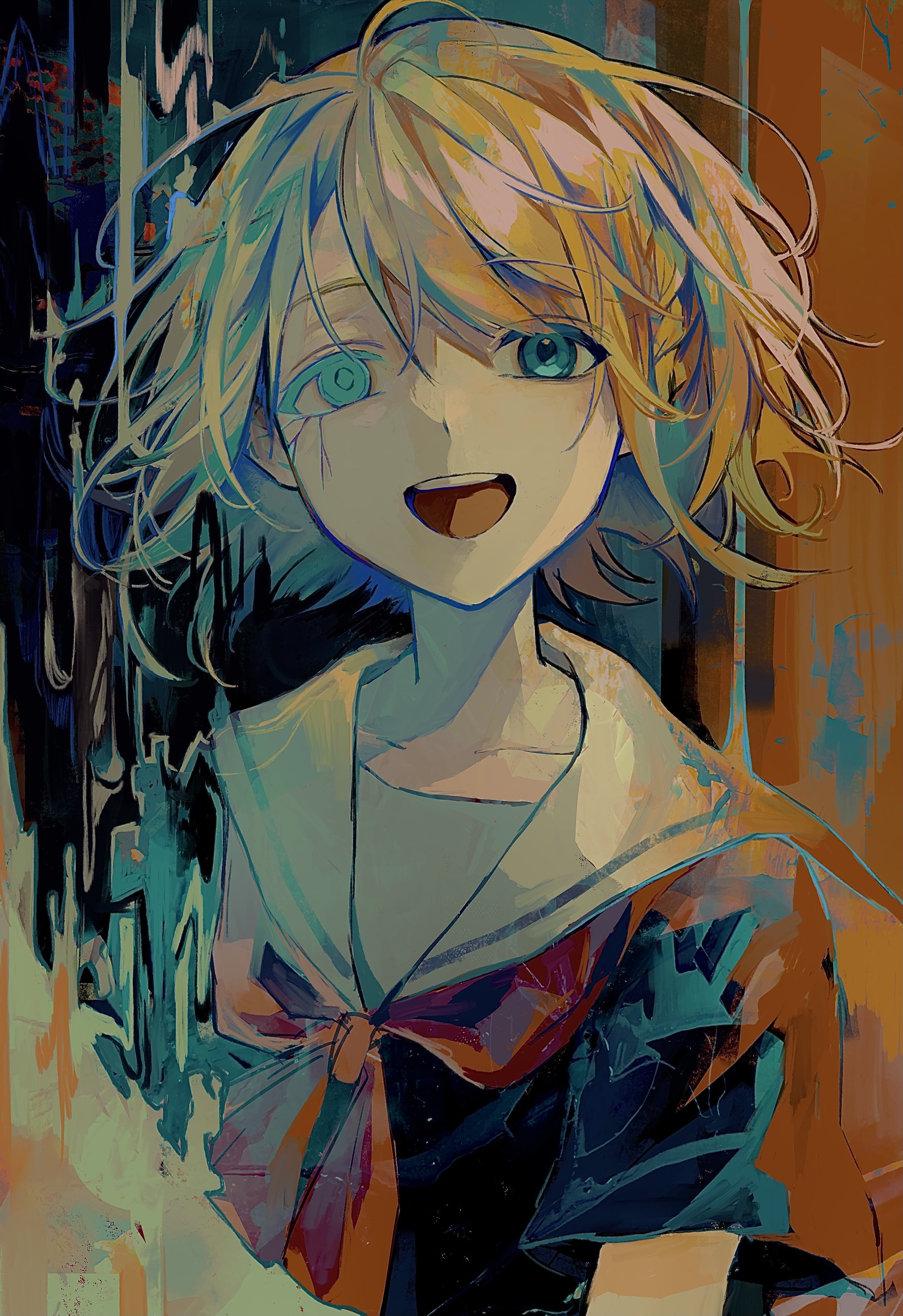 1girl :d absurdres aqua_background aqua_eyes aqua_hair black_background black_shirt blonde_hair braid cracked_skin grey_hair highres looking_at_viewer multicolored_background multicolored_hair neckerchief nowatari_hii open_mouth original red_neckerchief revision sailor_collar school_uniform serafuku shirt short_hair short_sleeves smile solo upper_body white_sailor_collar yellow_background
