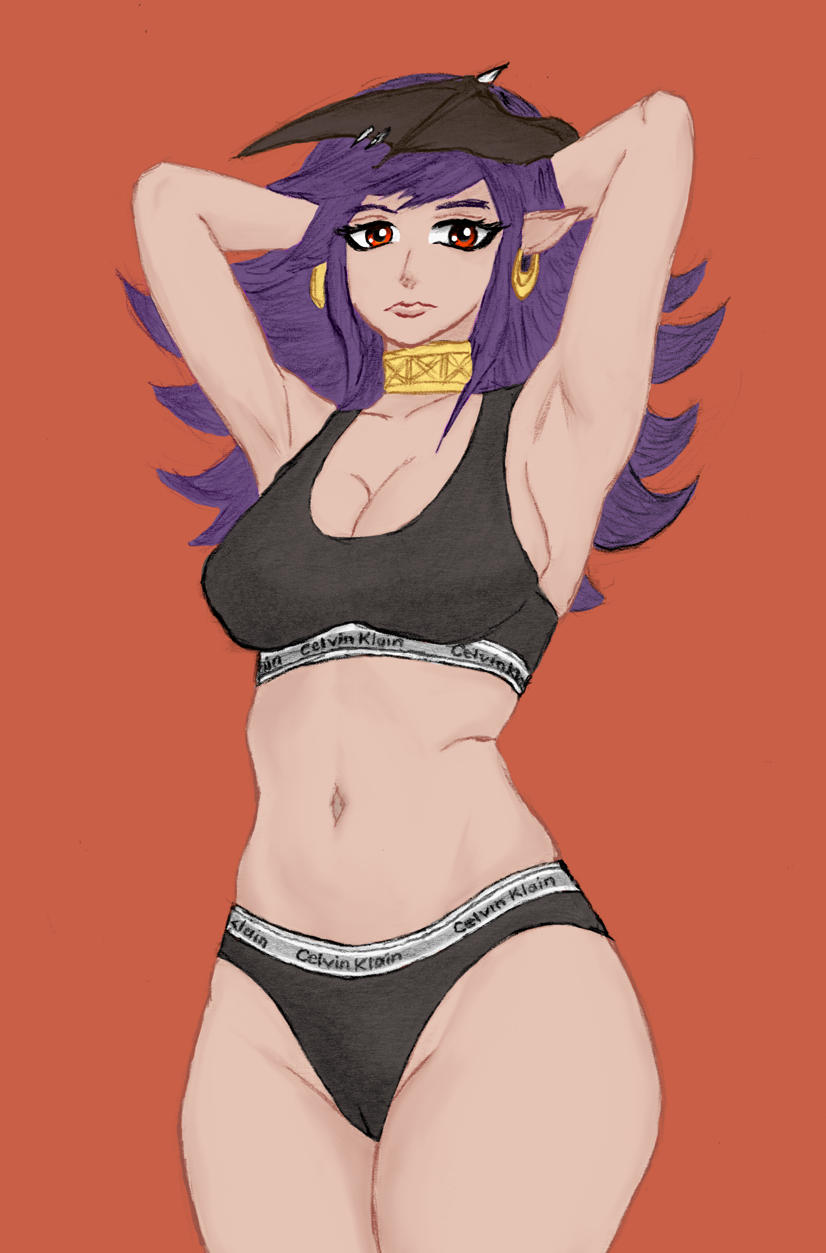absurdres black_bra black_panties bra breasts calvin_klein darklord_ixchel demon_girl earrings highres jewelry large_breasts lingerie panties purple_hair red_eyes sports_bra underwear yu-gi-oh!