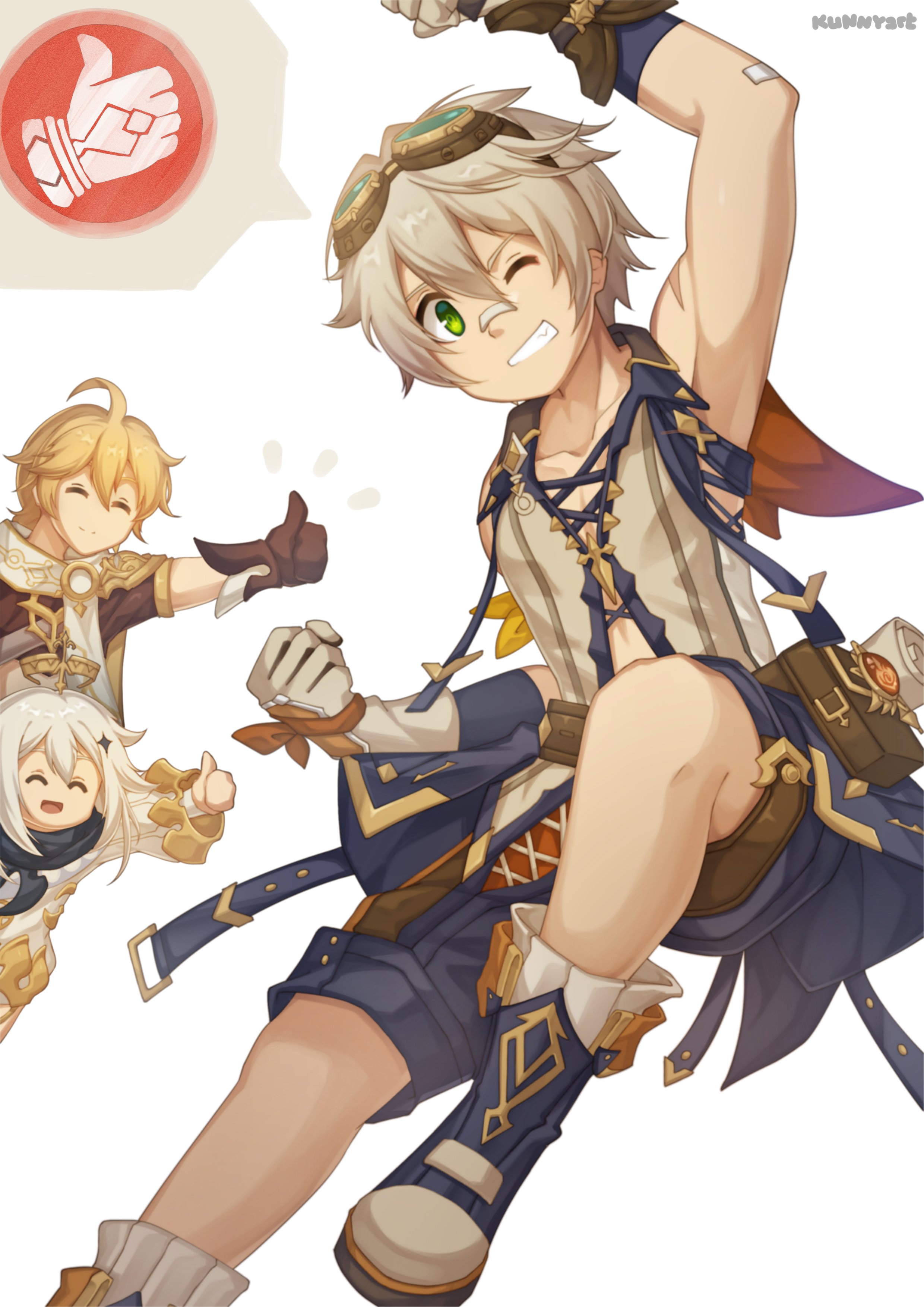 1girl 2boys absurdres aether_(genshin_impact) ahoge armband armpits bandaid bandaid_on_arm bandaid_on_face bandaid_on_nose bennett_(genshin_impact) blonde_hair blue_pants brown_gloves clenched_hand collarbone commentary crown genshin_impact gloves goggles goggles_on_head grey_hair hands_up highres kunknee looking_at_viewer multiple_boys one_eye_closed open_mouth paimon_(genshin_impact) pants pyro_symbol_(genshin_impact) scarf smile symbol-only_commentary teeth thumbs_up toned toned_male vision_(genshin_impact) white_background
