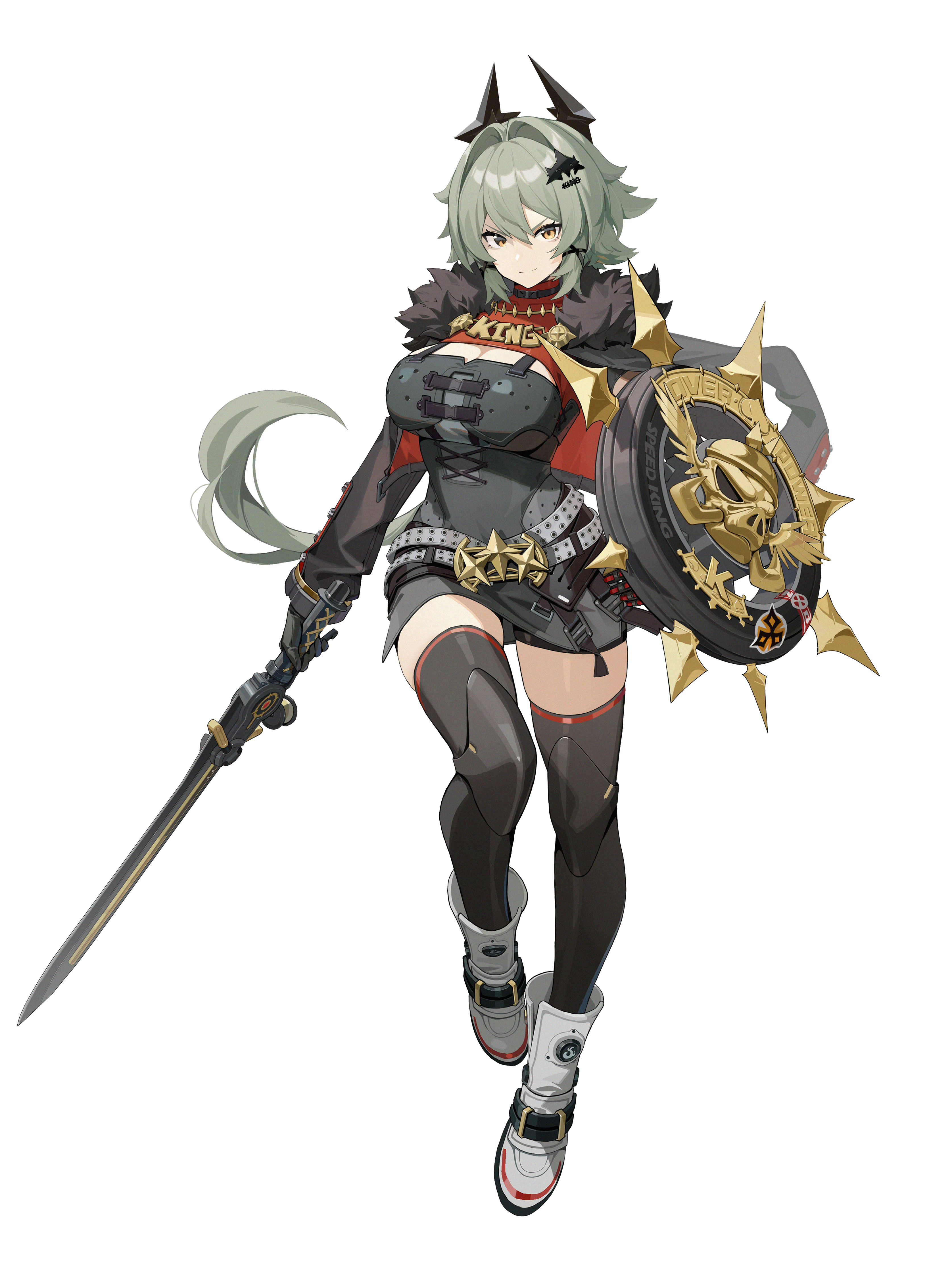 >:) 1girl absurdres belt black_jacket black_thighhighs boots breasts caesar_king_(zenless_zone_zero) chest_guard clasp cleavage collar emblem fake_horns film_grain full_body fur-trimmed_jacket fur_trim gold grey_belt grey_boots grey_hair hair_intakes hair_ornament highres holding holding_shield holding_sword holding_weapon horns improvised_weapon jacket large_breasts logo long_hair looking_at_viewer official_art ponytail prosthesis prosthetic_arm red_jacket shield short_shorts shorts smile solo spiked_shield spikes standing sword thighhighs thighs transparent_background turtleneck unused_tire v-shaped_eyebrows weapon x_hair_ornament yellow_eyes zenless_zone_zero