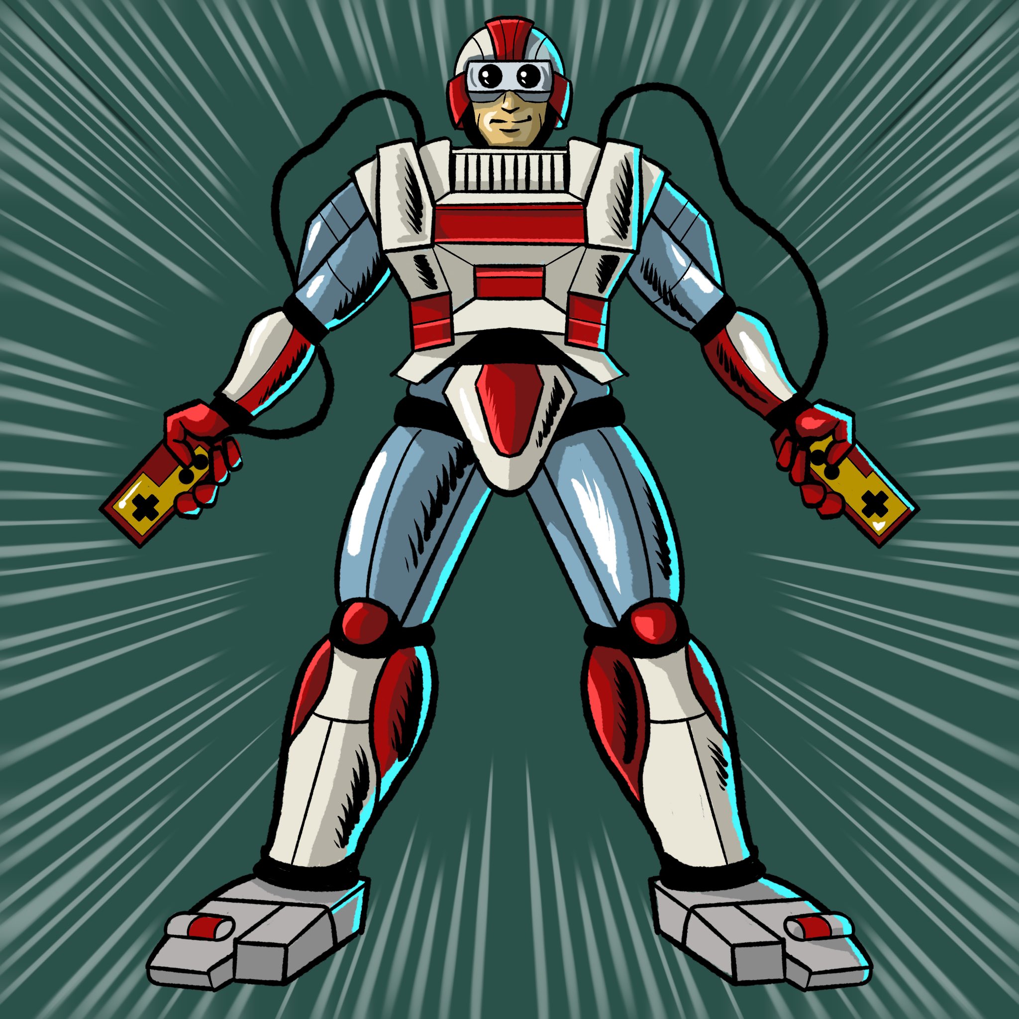 1boy armor blue_armor commentary_request controller dual_wielding emphasis_lines famicom famicom_gamepad full_body game_console game_controller gloves green_background grey_footwear helmet highres holding holding_controller holding_game_controller imamura_takaya looking_ahead male_focus nintendo personification power_suit red_armor red_footwear red_gloves red_helmet simple_background smile solo standing visor_(armor) white_armor white_helmet wiring