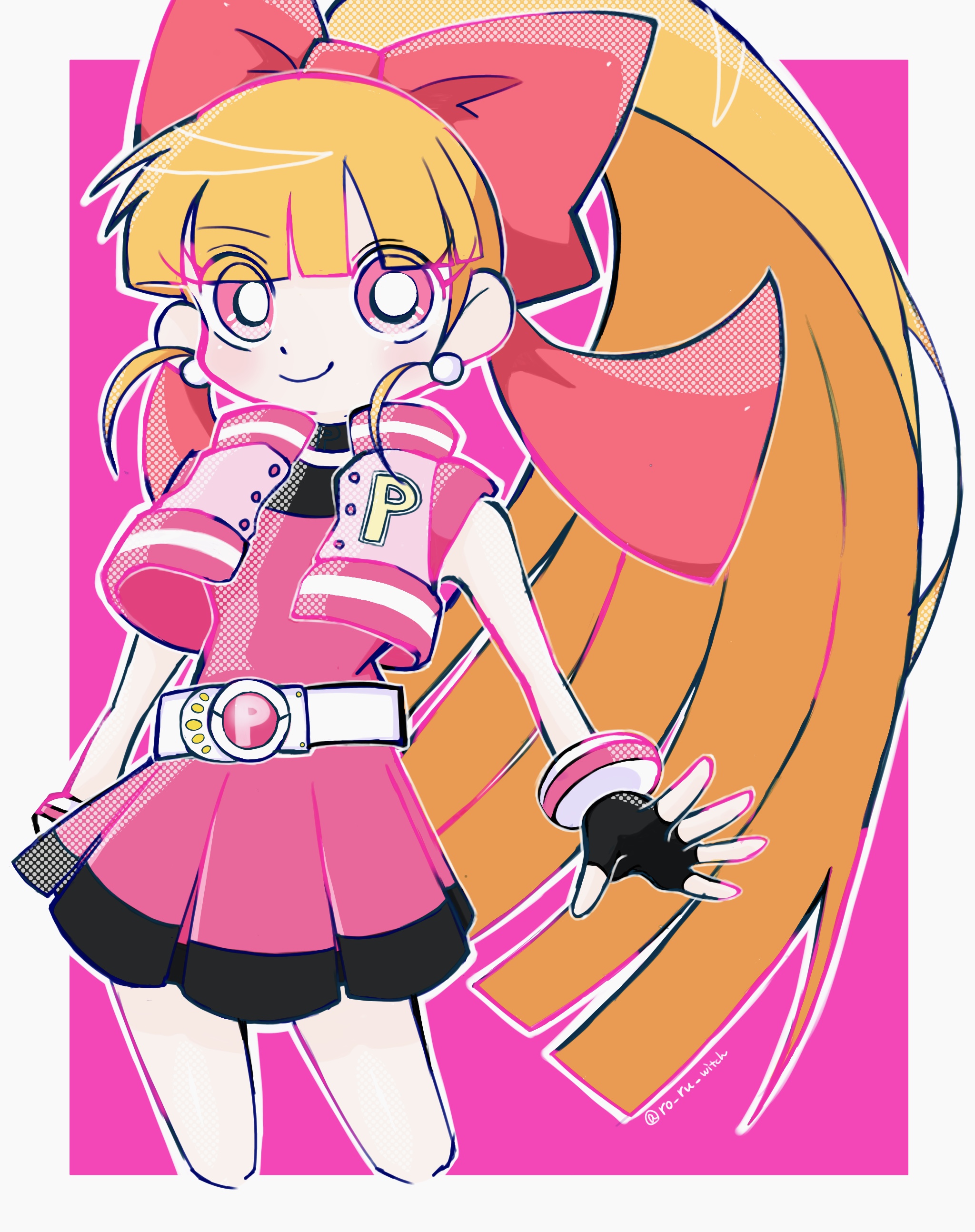 1girl absurdres akazutsumi_momoko black_gloves border bow bright_pupils closed_mouth cropped_jacket cropped_legs dress earrings fingerless_gloves gloves hair_bow highres hyper_blossom jacket jewelry long_hair looking_at_viewer orange_eyes pink_dress pink_jacket powerpuff_girls_z red_bow ro_ru_witch sleeveless sleeveless_jacket smile solo twitter_username white_border white_pupils