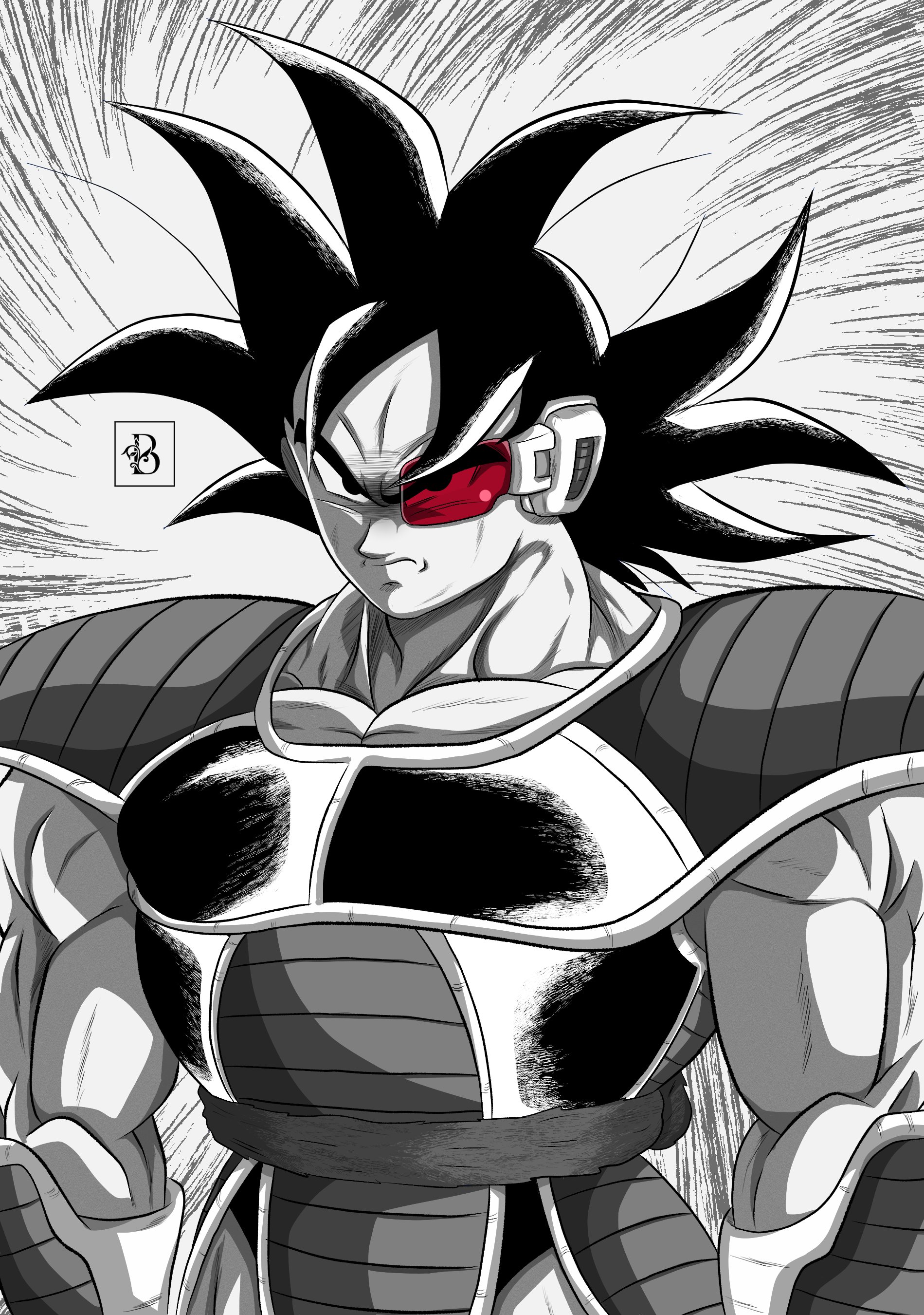 1boy absurdres annoyed artist_logo blannis closed_mouth dragon_ball dragonball_z greyscale highres logo looking_at_viewer male_focus monochrome muscular saiyan saiyan_armor tail tullece upper_body