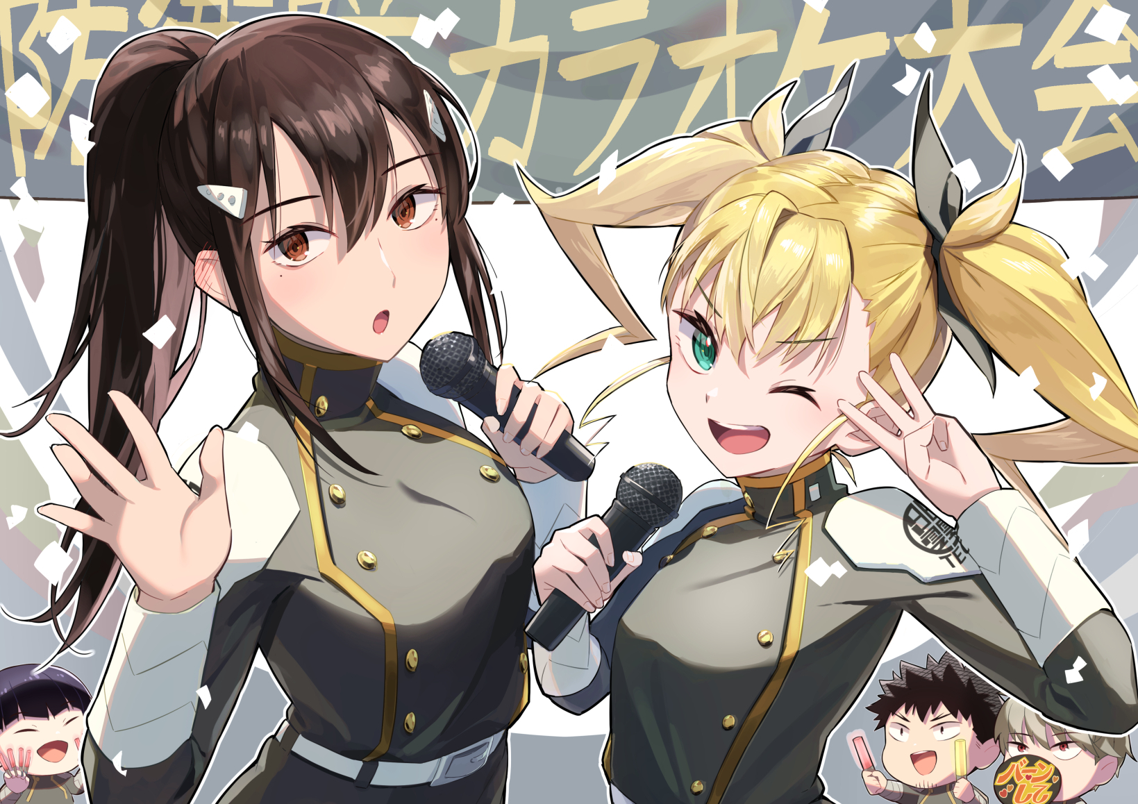 2girls 3boys ashiro_mina black_hair black_ribbon blonde_hair breasts closed_eyes confetti green_eyes hibino_kafka highres hoshina_soshiro ichikawa_reno kaijuu_no._8 long_sleeves medium_breasts microphone military_uniform multiple_boys multiple_girls nonono_(1399900) one_eye_closed open_mouth ponytail red_eyes ribbon shinomiya_kikoru short_hair short_twintails spiked_hair twintails v-shaped_eyebrows w