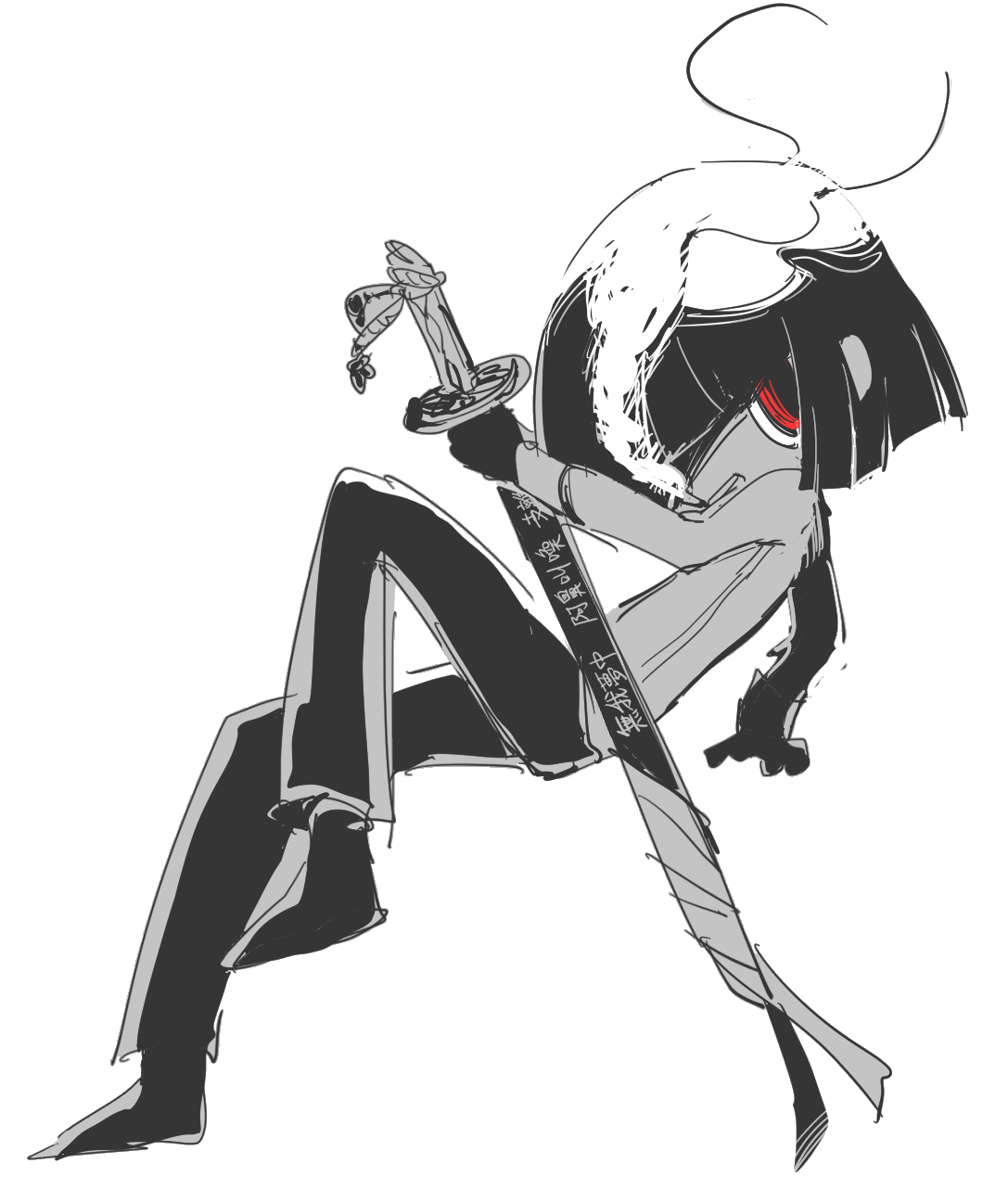 1girl atoymk black_footwear black_hair black_pants blowing_smoke chibi highres katana limbus_company pants project_moon red_eyes ryoshu_(project_moon) shirt short_hair simple_background sketch smoke smoking solo sword weapon white_background white_shirt