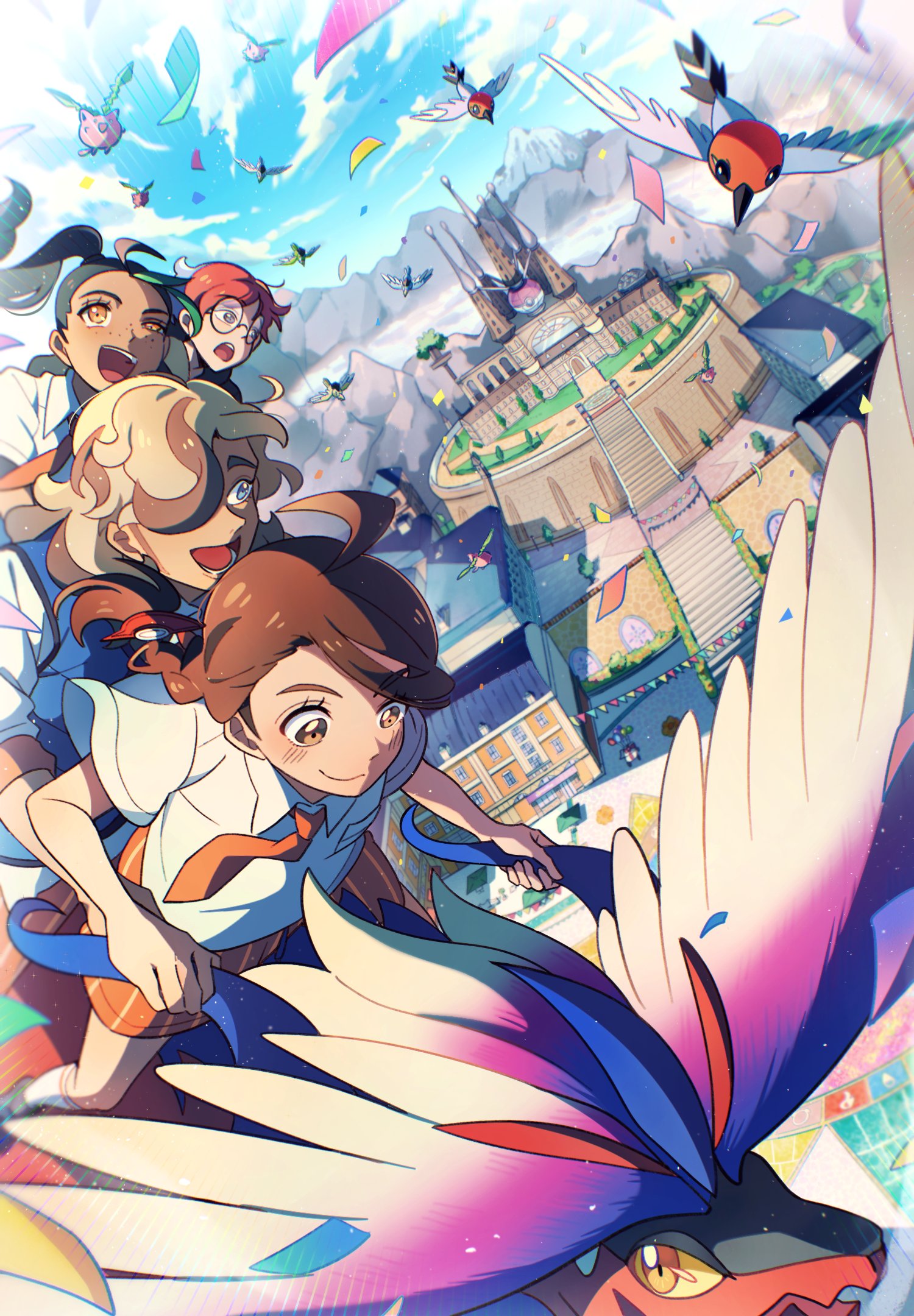 1boy 3girls ahoge arven_(pokemon) blue_vest brown_eyes brown_hair building closed_mouth cloud collared_shirt day eyelashes fletchling gen_2_pokemon gen_6_pokemon hashtag-only_commentary highres holding hoppip juliana_(pokemon) koraidon multicolored_hair multiple_girls necktie nemona_(pokemon) nintendo orange_necktie orange_shorts outdoors penny_(pokemon) pokemon pokemon_sv ponytail riding riding_pokemon school_uniform selyg15 shirt shoes shorts sky smile socks squawkabilly squawkabilly_(blue) squawkabilly_(green) squawkabilly_(white) squawkabilly_(yellow) stairs two-tone_hair vest white_shirt white_socks