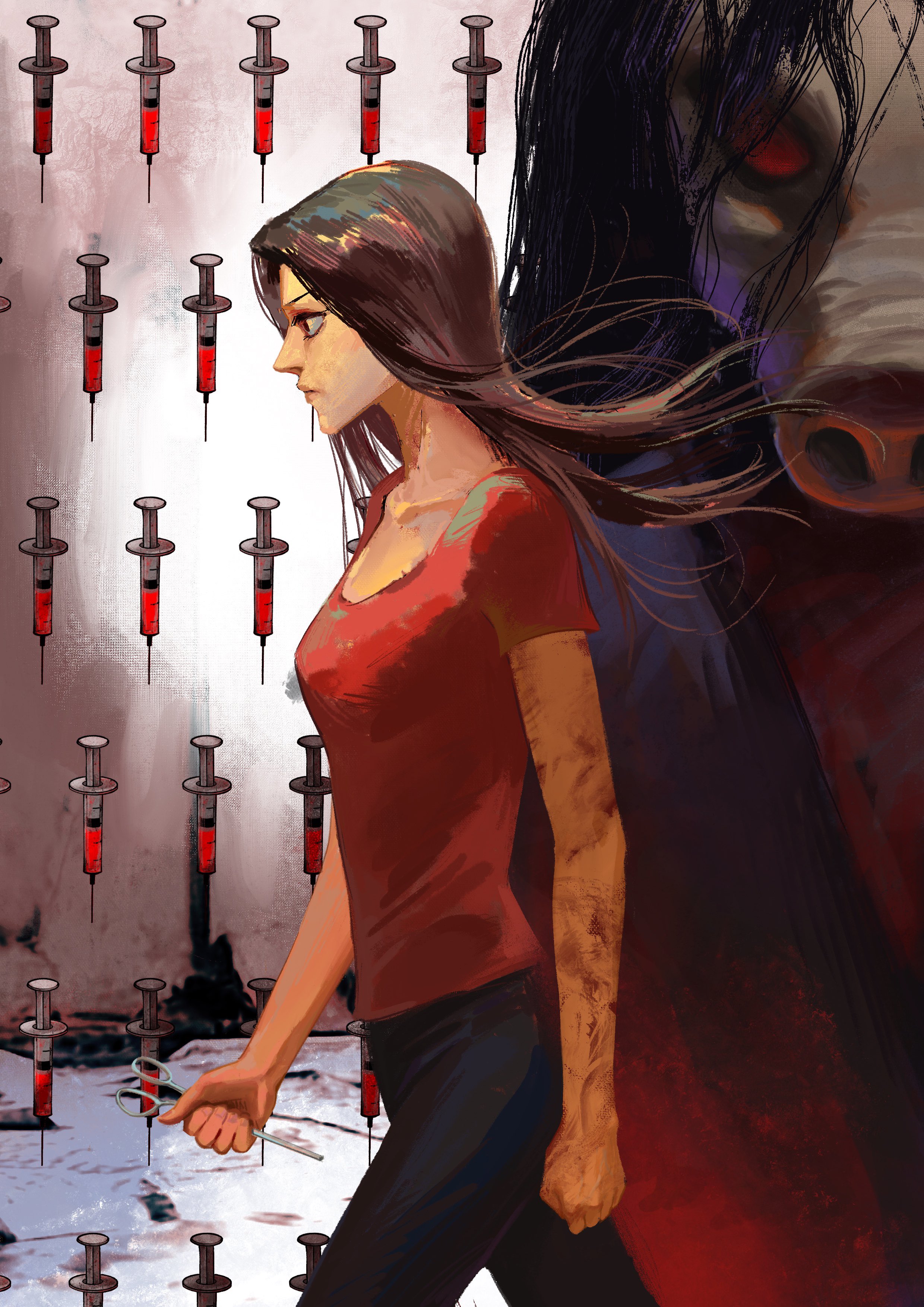 1girl absurdres amanda_young black_pants blood blood_on_arm brown_eyes brown_hair bruise bruise_on_arm chinese_commentary clenched_hands closed_mouth collarbone cowboy_shot from_side highres holding holding_scissors injury long_hair looking_ahead pants pig_mask red_shirt sanho_sanho saw_(movie) scissors shirt short_sleeves solo syringe t-shirt walking