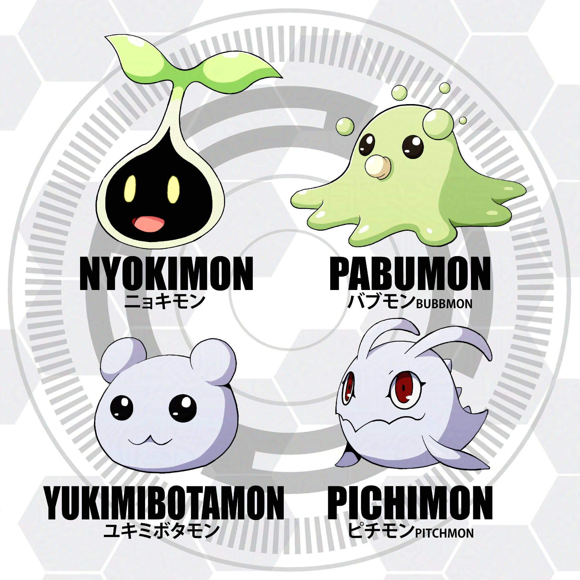 bubbmon circle d_sandy digimon digimon_(creature) digimon_adventure happy highres leaf nyokimon pitchmon red_eyes smile tail yellow_eyes yukimibotamon