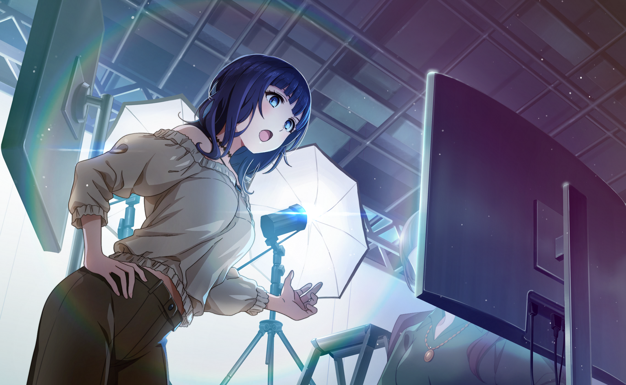 2girls asaka_karin backlighting bare_shoulders black_hair black_pants blue_eyes blue_hair blunt_bangs blush breasts ceiling chain chain_necklace collared_shirt cowboy_shot dutch_angle eye_reflection faceless faceless_female frilled_shirt frilled_sleeves frills from_below green_shirt hand_on_own_hip hand_up highres indoors jewelry ladder large_breasts lens_flare light_particles light_rays looking_at_object love_live! love_live!_nijigasaki_high_school_idol_club love_live!_school_idol_festival_2 medium_hair monitor multiple_girls necklace off-shoulder_shirt off_shoulder official_art open_mouth pants pendant rainbow reflection shadow shirt solo_focus stepladder stomach truss umbrella white_shirt white_umbrella