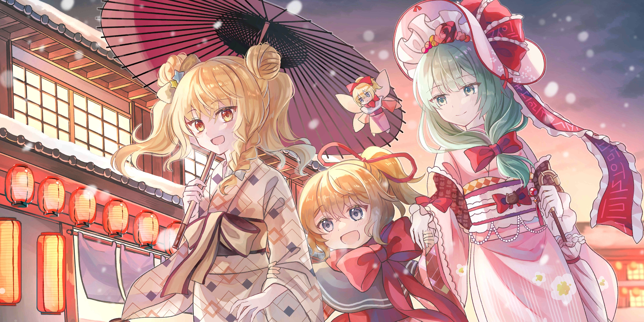 4girls :d alternate_costume blonde_hair bonnet bow braid brown_kimono double_bun front_ponytail green_eyes green_hair hair_bow hair_bun hair_ribbon hat height_difference highres holding holding_hands holding_umbrella japanese_clothes kagiyama_hina kagiyama_hina_(secluded_spring_cleansing) kimono kirisame_marisa kirisame_marisa_(hot_spring-obsessed_magician) lantern long_hair long_sleeves looking_at_viewer medicine_melancholy medicine_melancholy_(medicinal_underworld_bath) miyakure multiple_girls oil-paper_umbrella open_mouth outdoors paper_lantern pink_hat pink_kimono ponytail red_bow red_ribbon ribbon side_braid smile snowing su-san third-party_source touhou touhou_lostword twintails umbrella white_bow wide_sleeves yukata
