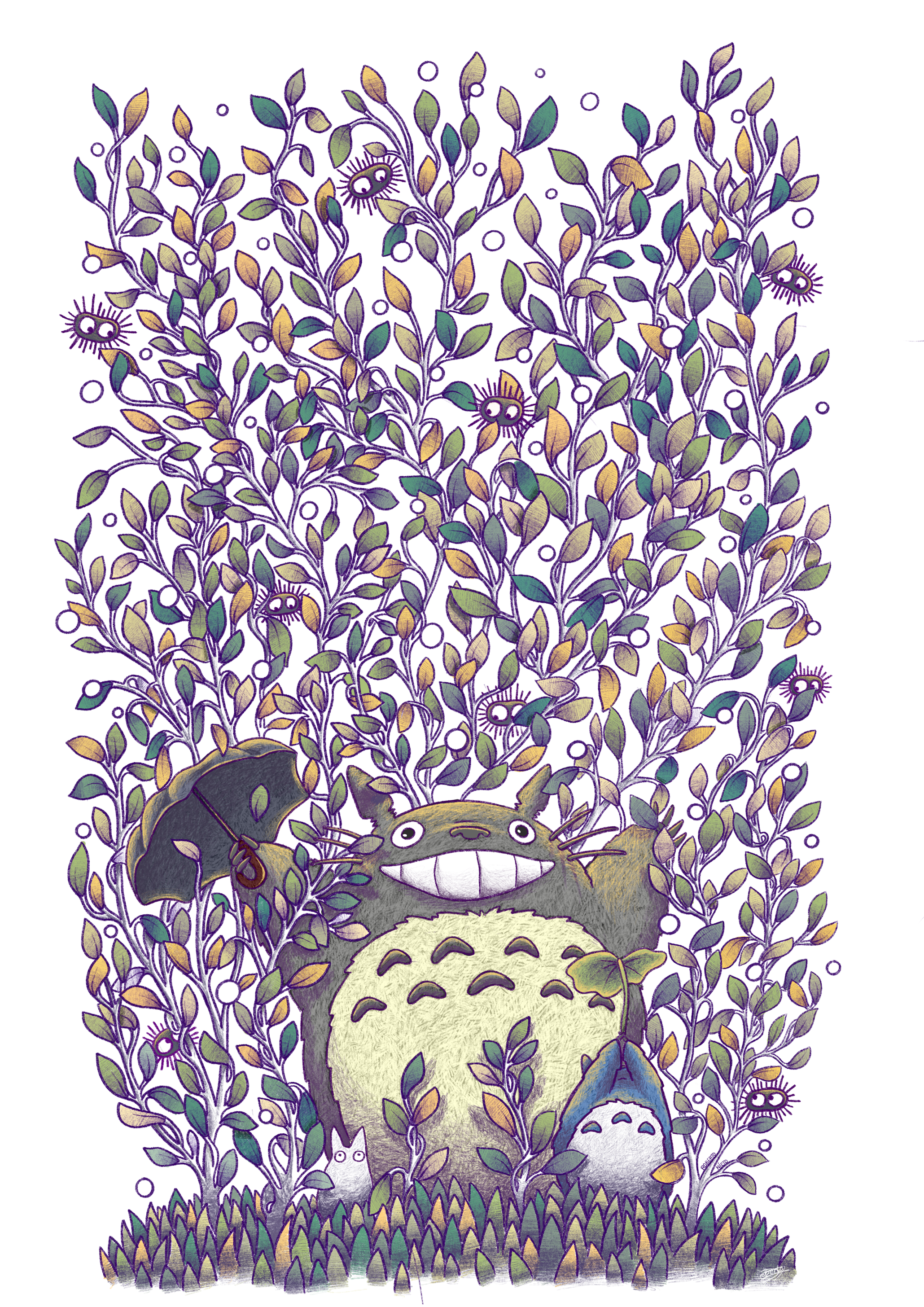absurdres arms_up chibi_totoro chuu_totoro commentary creature english_commentary highres holding holding_leaf holding_umbrella leaf looking_at_another looking_at_viewer nature no_humans simple_background smile susuwatari syntetyc tonari_no_totoro totoro umbrella whiskers white_background