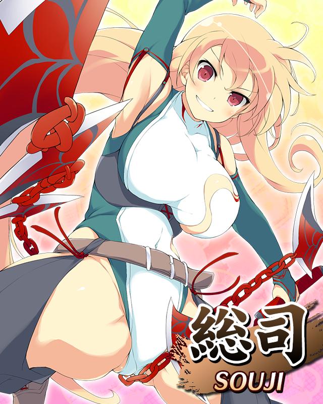 1girl blonde_hair blush breasts bridal_gauntlets card_(medium) chain chain_whip grin holding holding_weapon large_breasts leotard looking_at_viewer red_eyes red_ribbon ribbon senran_kagura senran_kagura_new_wave smile smirk smug solo souji_(senran_kagura) spiked_chain spread_legs weapon yaegashi_nan