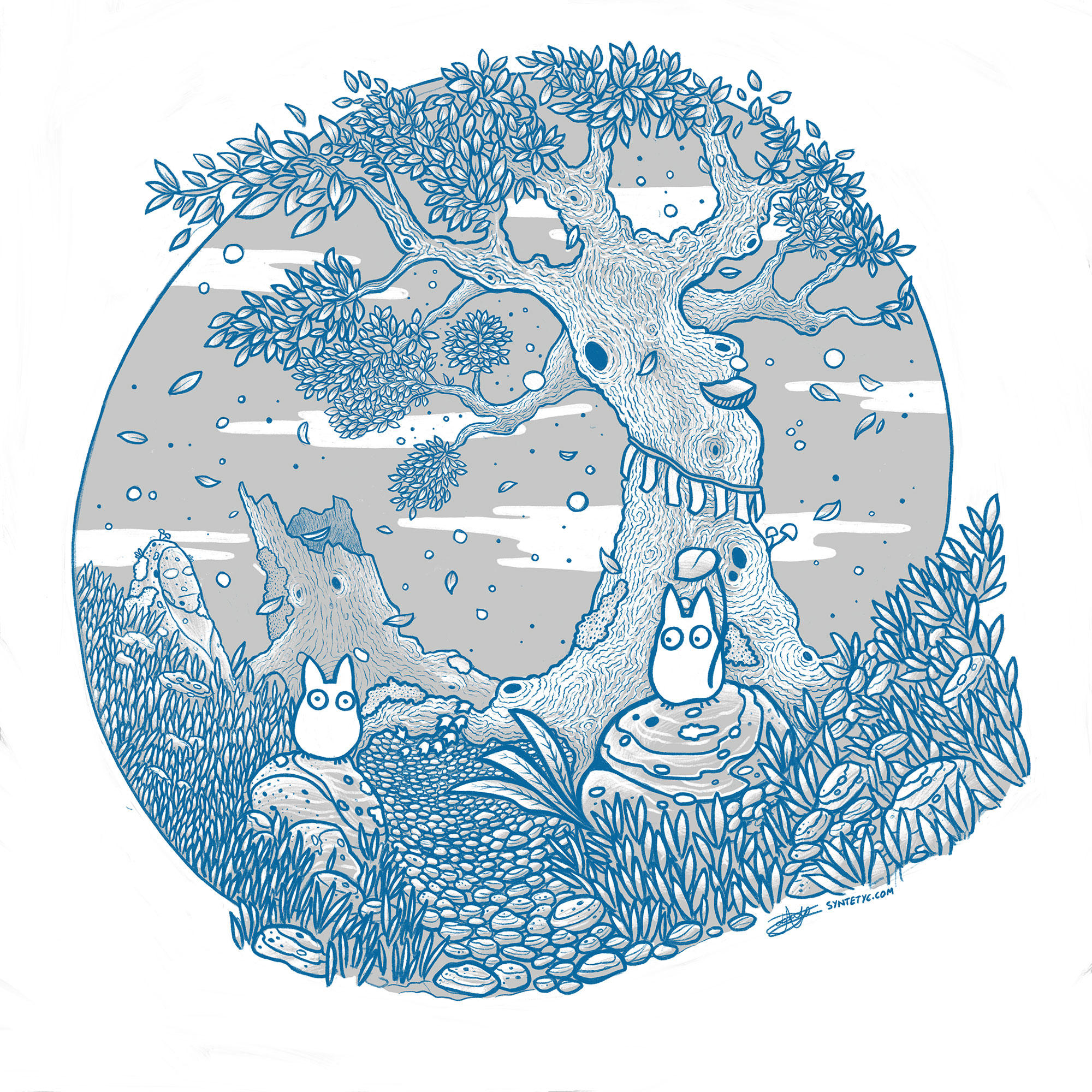 chibi_totoro cloud commentary english_commentary falling_feathers feathers highres holding holding_leaf leaf limited_palette nature no_humans outdoors oval petals syntetyc tonari_no_totoro tree white_background