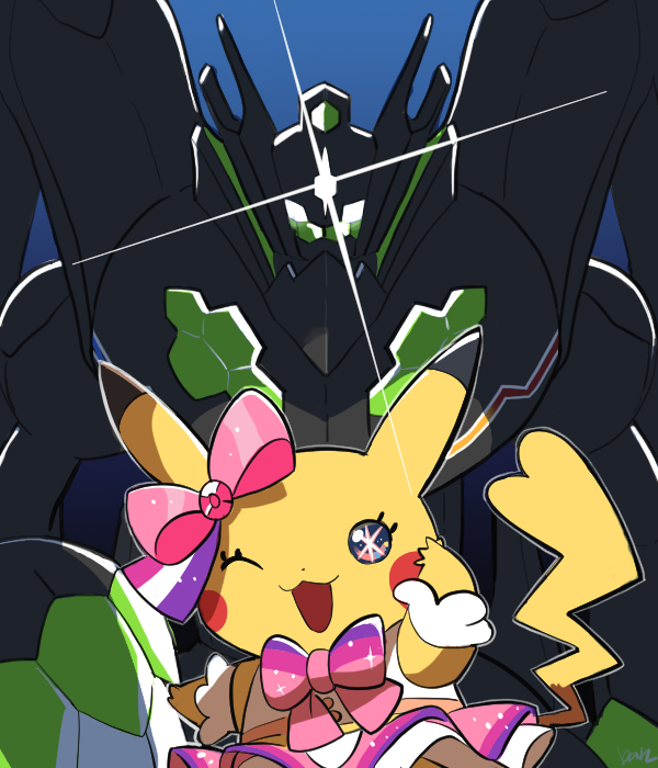 :3 ban_(ban62460424) blue_background bow cosplay_pikachu eyelashes gen_1_pokemon gen_6_pokemon glint hair_bow legendary_pokemon nintendo no_humans one_eye_closed open_mouth oshi_no_ko pikachu pikachu_pop_star pink_bow pink_skirt pokemon pokemon_(creature) shirt simple_background skirt sparkling_eyes white_shirt wrist_cuffs zygarde