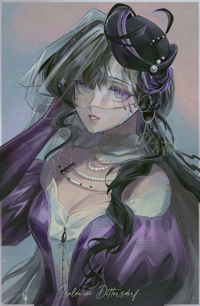 1girl bare_shoulders black_flower black_hair black_hat black_rose breasts character_name chikenug1000000 cleavage dress flower grey_background hand_in_own_hair hand_up hat hat_flower isolde_(reverse:1999) jewelry juliet_sleeves long_hair long_sleeves looking_at_viewer medium_breasts necklace off_shoulder parted_lips pearl_necklace pink_lips puffy_sleeves purple_dress purple_eyes purple_flower purple_rose reverse:1999 rose see-through_clothes see-through_veil solo teeth twitter_username two-tone_background upper_body veil very_long_hair wavy_hair