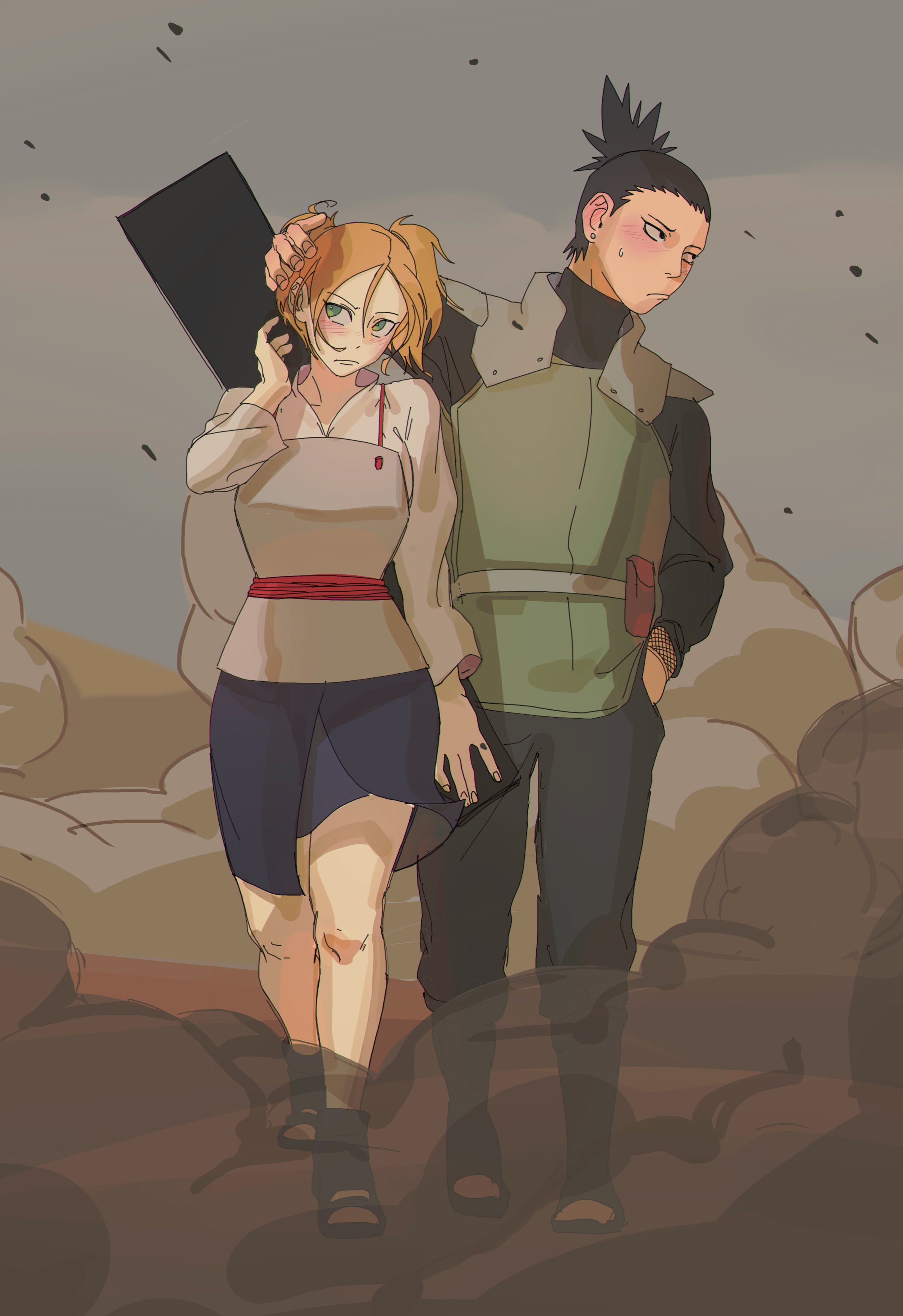 1boy 1girl absurdres black_hair blonde_hair blush breasts closed_mouth couple dust_cloud folding_fan green_eyes hair_between_eyes hair_up hand_fan hand_in_pocket hand_up height_difference high_ponytail highres holding holding_fan japanese_clothes konohagakure_shinobi_uniform korean_commentary large_breasts long_sleeves looking_to_the_side nara_shikamaru naruto_(series) naruto_shippuuden nervous outdoors pants ponytail short_twintails sna9_104 standing sweatdrop temari_(naruto) twintails weapon weapon_on_back wind