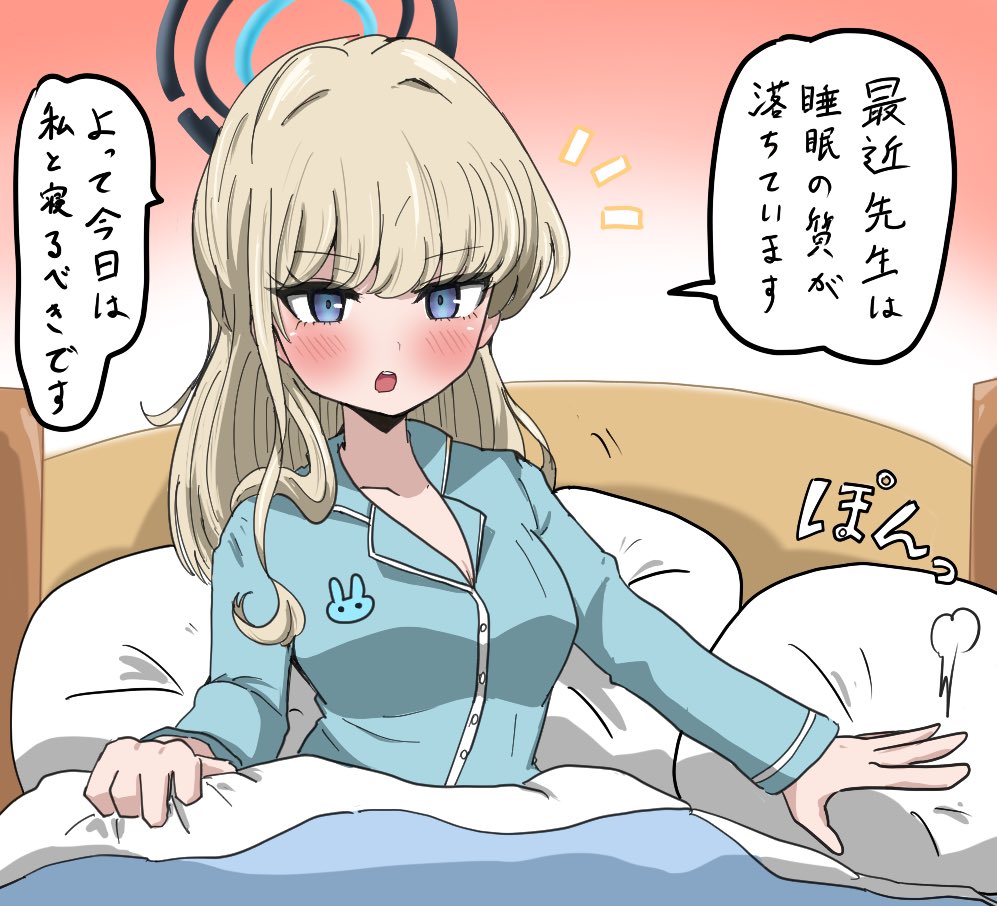 1girl animal_print blanket blonde_hair blue_archive blue_eyes blue_pajamas blue_shirt blunt_bangs blush check_translation fur_trim guratan366 hair_between_eyes long_hair looking_at_viewer on_bed open_mouth pajamas pillow rabbit_print shirt sidelocks toki_(blue_archive) translation_request under_covers