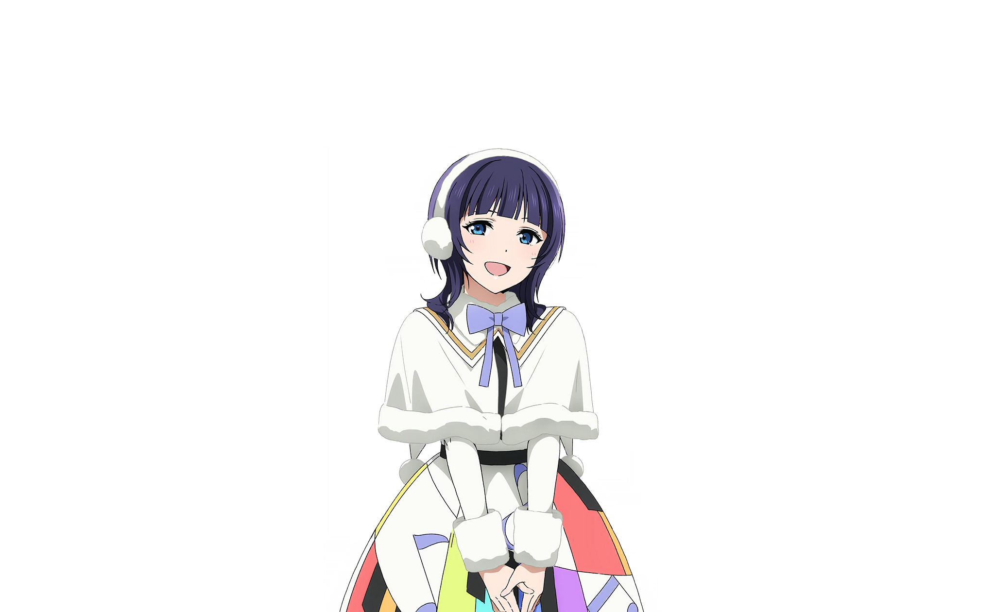 1girl asaka_karin blue_eyes blue_hair blue_ribbon blunt_bangs blush capelet colorful_dreams!_colorful_smiles!_(love_live!) cowboy_shot dress earmuffs fur-trimmed_capelet fur-trimmed_collar fur_trim highres long_sleeves looking_at_viewer love_live! love_live!_nijigasaki_high_school_idol_club love_live!_school_idol_festival_2 medium_hair musical_note musical_note_print neck_ribbon official_art open_mouth own_hands_together piano_print rainbow_print rainbow_skirt ribbon smile solo standing transparent_background v_arms white_capelet white_dress
