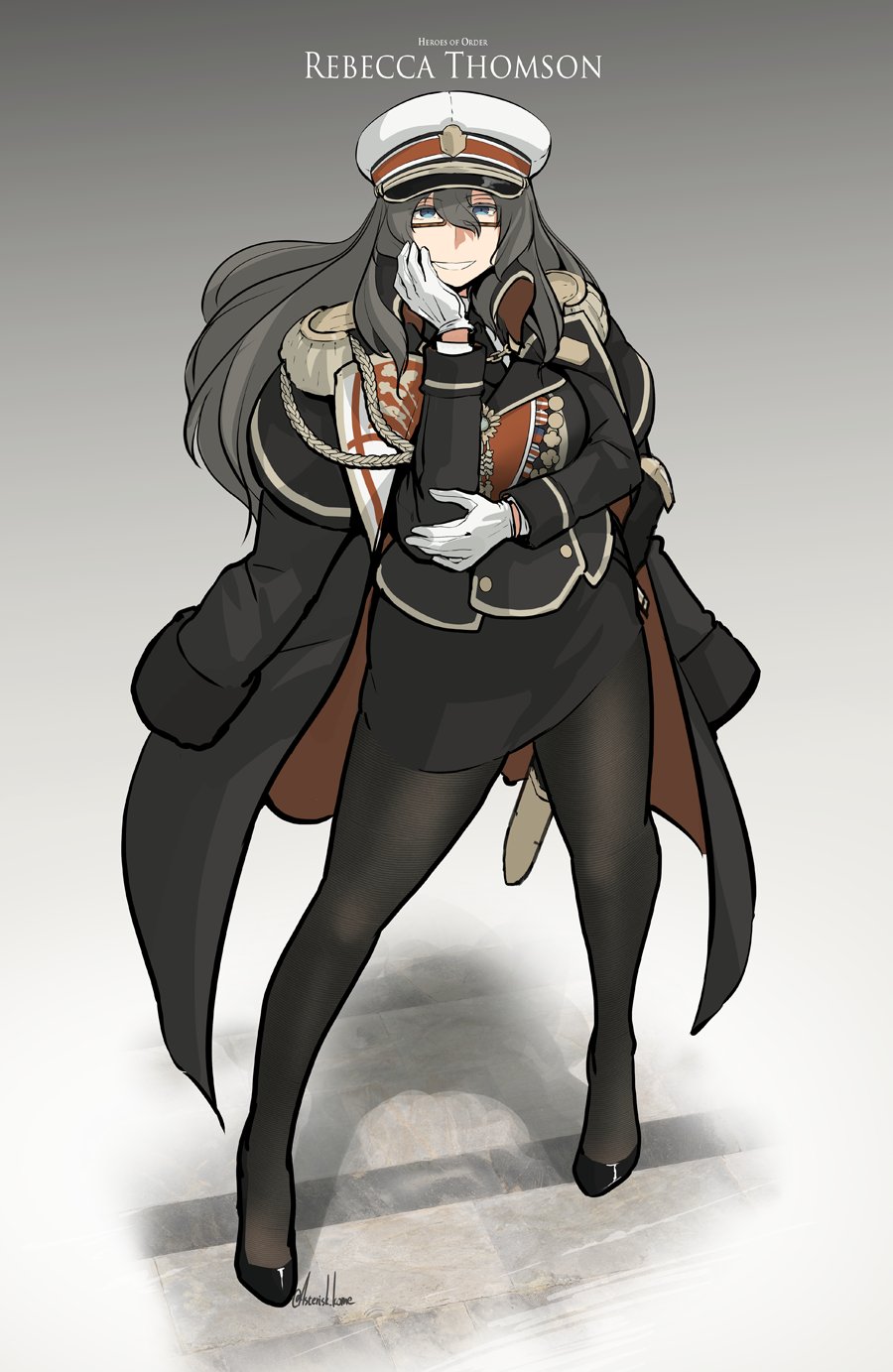 1girl aiguillette asterisk_kome black_necktie black_pantyhose blue_eyes breasts character_name coat epaulettes full_body glasses gloves gradient_background grey_hair hand_on_own_cheek hand_on_own_face hat heroes_of_order high_heels highres large_breasts long_hair looking_at_viewer military_dress_uniform military_uniform necktie overcoat pantyhose peaked_cap pencil_skirt rebecca_thomson scabbard sheath skirt smirk solo stiletto_heels sword weapon white_gloves white_hair