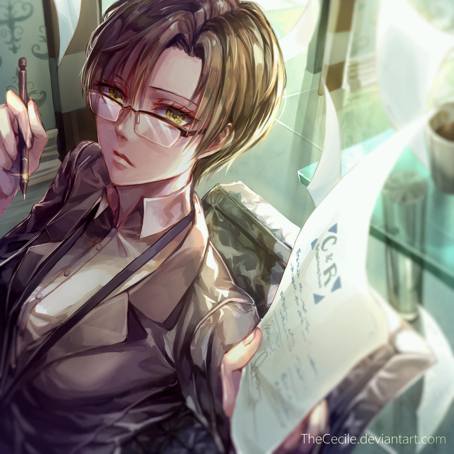 1girl black_jacket brown_hair chair coffee_mug commentary cup deviantart_username english_commentary eyelashes flying_paper glass_table highres holding holding_paper holding_pen indoors jacket kang_jaehee lanyard looking_at_viewer mug office_lady outstretched_arm paper pen shirt solo susanghan_messenger table the_cecile upper_body white_shirt yellow_eyes