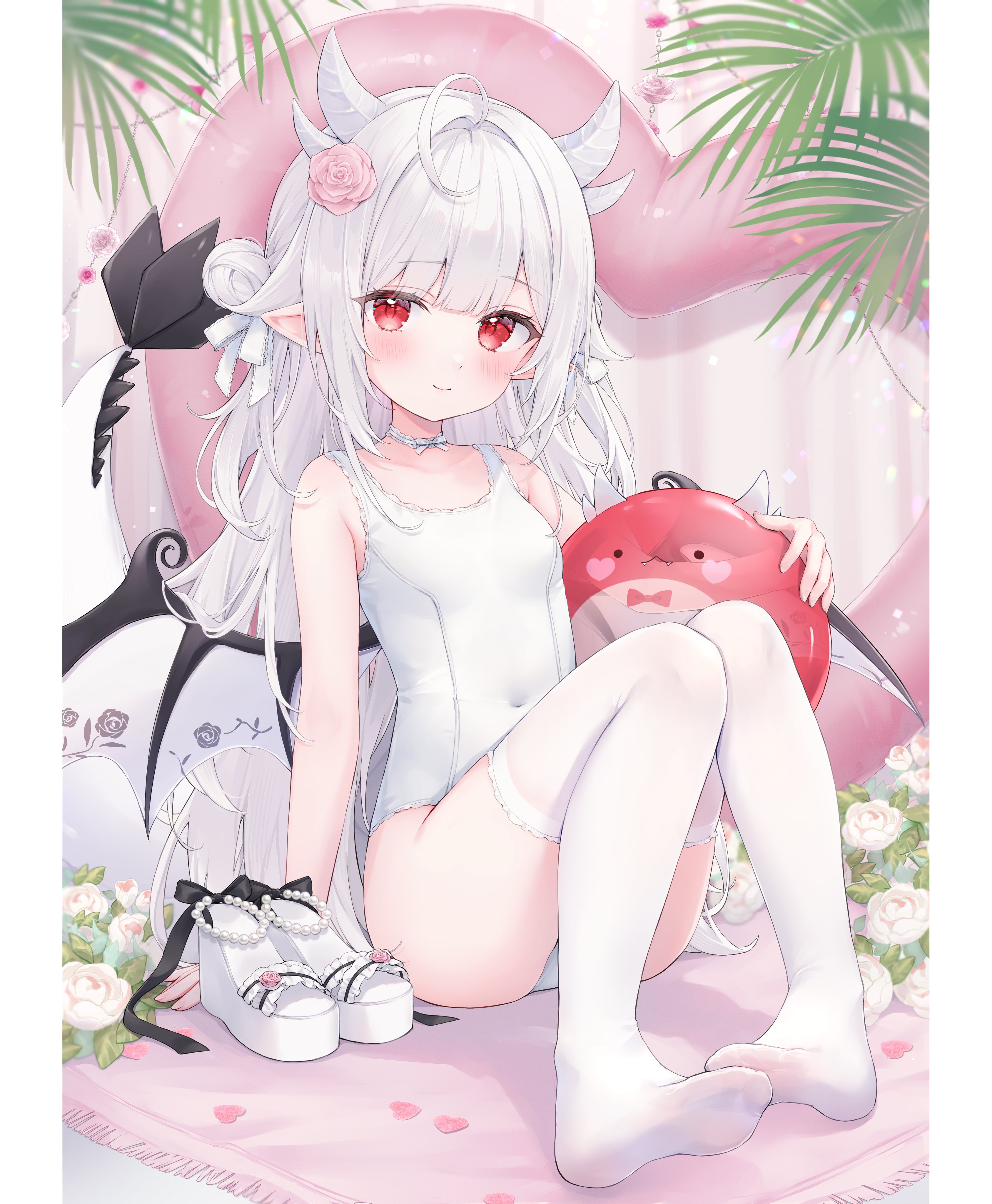 absurdres bad_link breasts feet highres horns kamuri_amuru red_eyes small_breasts stocks swimsuit white_hair