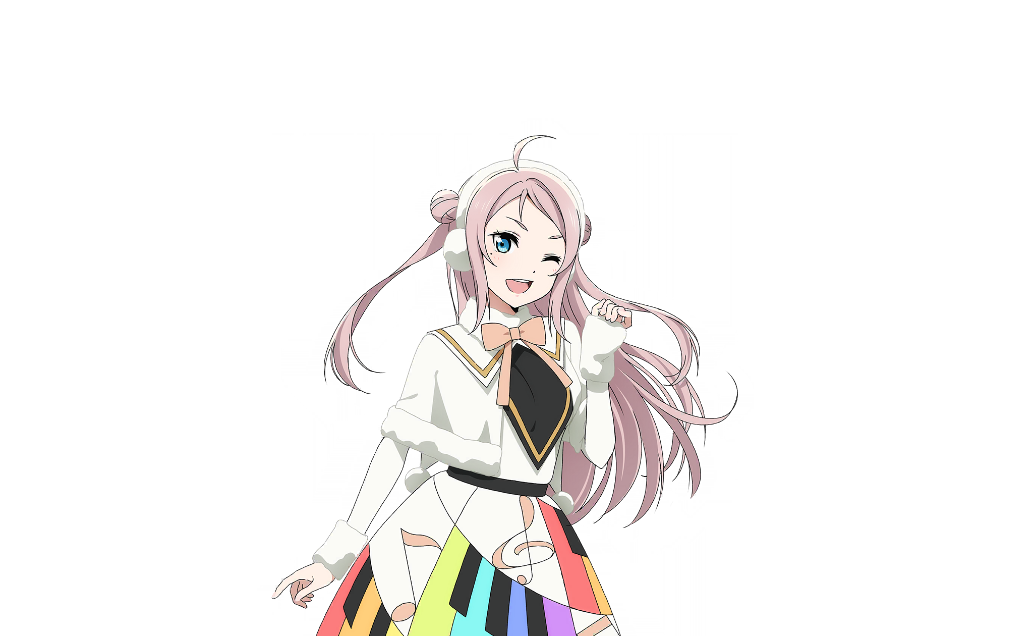 1girl ;d ahoge blue_eyes blush bow capelet colorful_dreams!_colorful_smiles!_(love_live!) cowboy_shot double_bun dress earmuffs fur-trimmed_capelet fur-trimmed_collar fur_trim hair_bun hand_up highres long_hair long_sleeves looking_at_viewer love_live! love_live!_nijigasaki_high_school_idol_club love_live!_school_idol_festival_2 mole mole_under_eye musical_note musical_note_print neck_ribbon official_art one_eye_closed open_mouth piano_print pink_bow pink_hair rainbow_print rainbow_skirt ribbon sidelocks smile solo teeth transparent_background two_side_up upper_teeth_only white_capelet white_dress zhong_lanzhu