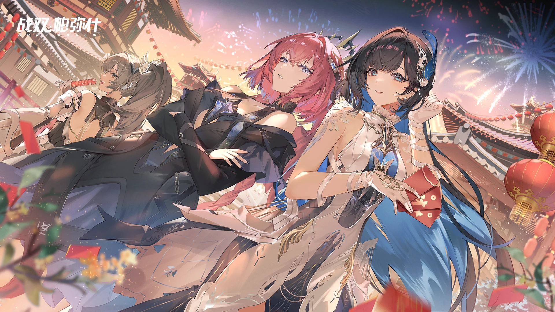anniversary architecture bandaged_arm bandages black_hair blue_eyes blue_hair chinese_new_year crossed_arms crown dress east_asian_architecture eating fireworks flower grey_hair hair_ornament headgear highres hongbao ishmael:_parhelion_(pgr) ishmael_(pgr) lantern looking_at_viewer mechanical_arms multicolored_hair nanami:_startrail_(pgr) nanami_(pgr) official_art paper_lantern pink_hair ponytail punishing:_gray_raven selena:_pianissimo_(pgr) selena_(pgr) smile two-tone_hair