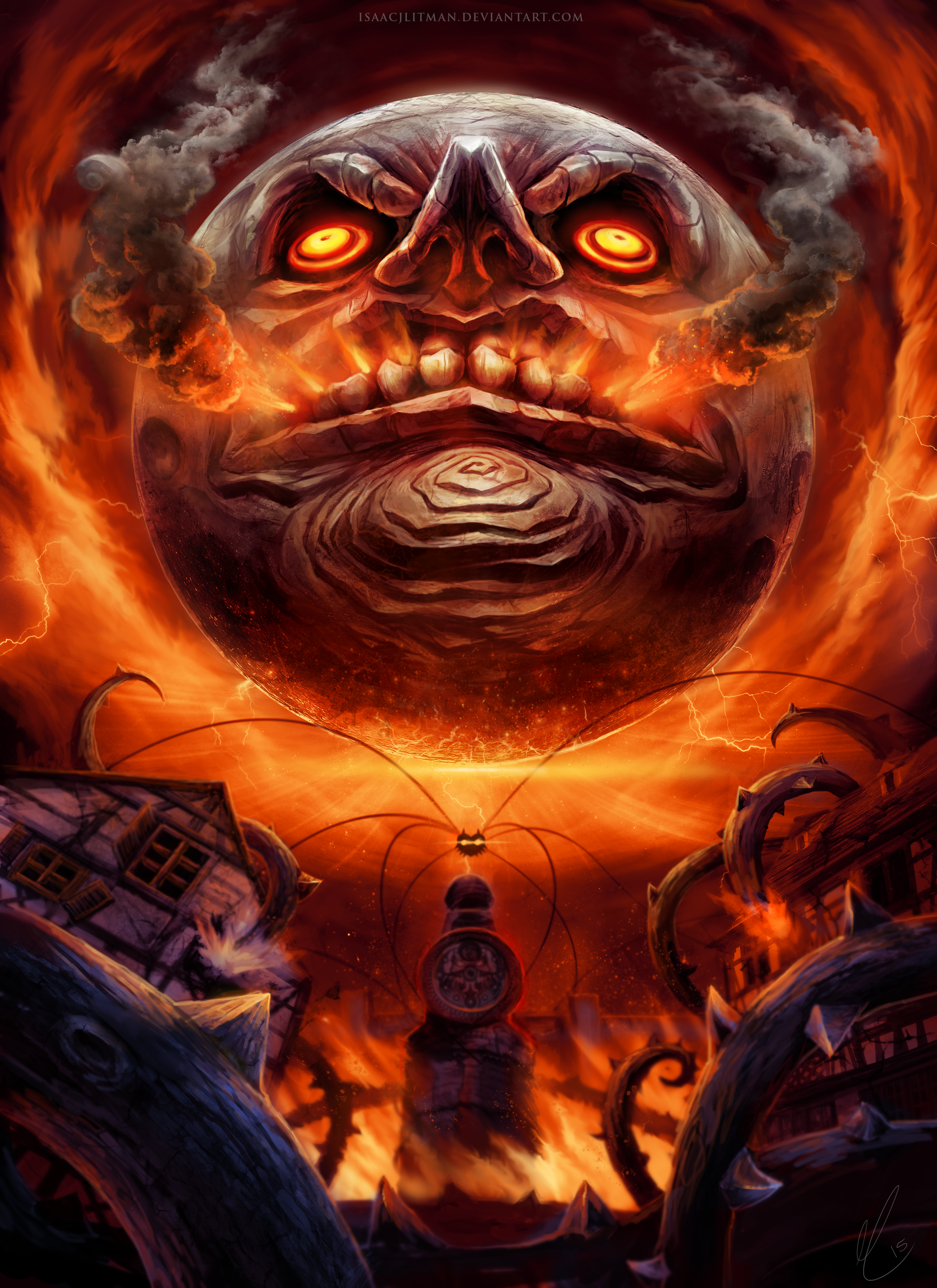 absurdres commentary destruction deviantart_username electricity english_commentary fire glowing glowing_eyes highres house in-universe_location isaacjlitman majora_(entity) moon_(zelda) nintendo no_humans outdoors signature smoke teeth the_legend_of_zelda the_legend_of_zelda:_majora's_mask thorns